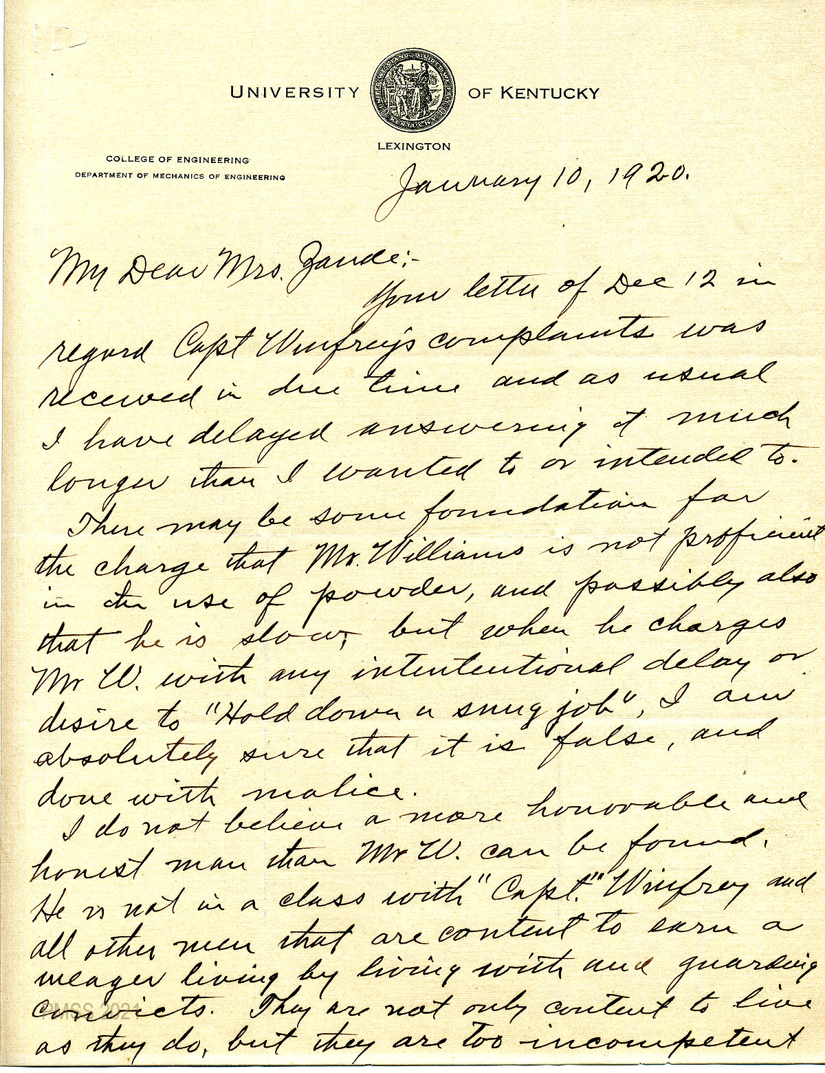 04 – 07 January 10, 1920. Four-page handwritten letter to Zande from J.R. Johnson, College of Engineering, University of Kentucky, Lexington, [04] who gives his opinion concerning Captain Winfrey’s complaints about Mr. Williams, calling him “honorable and honest.” [05] He describes Mr. Williams’ powder work in the quarry; advises that Zande report the matter to the state department. [06 – 07] He also advises Zande “to call Mr. Watkins over early and keep after the department constantly.”