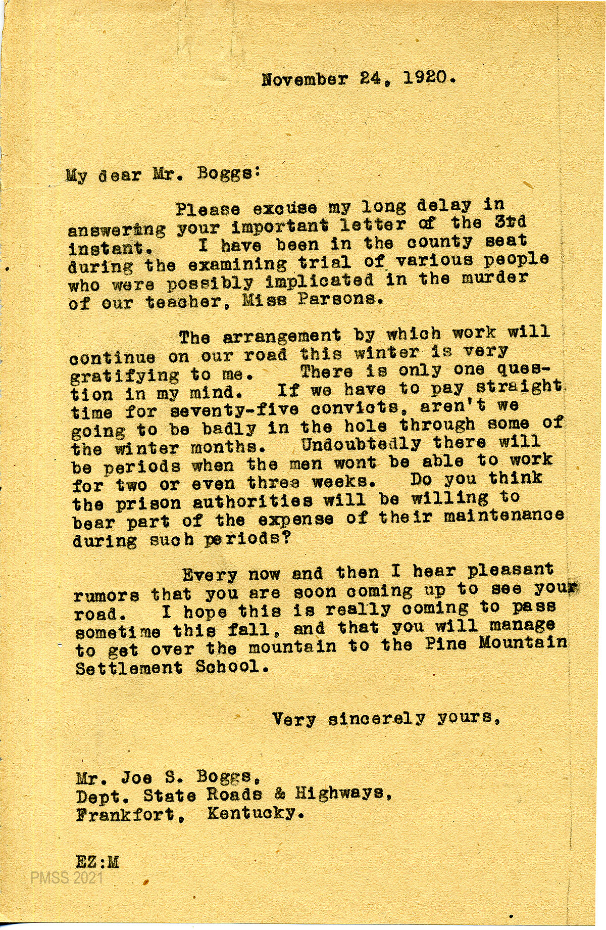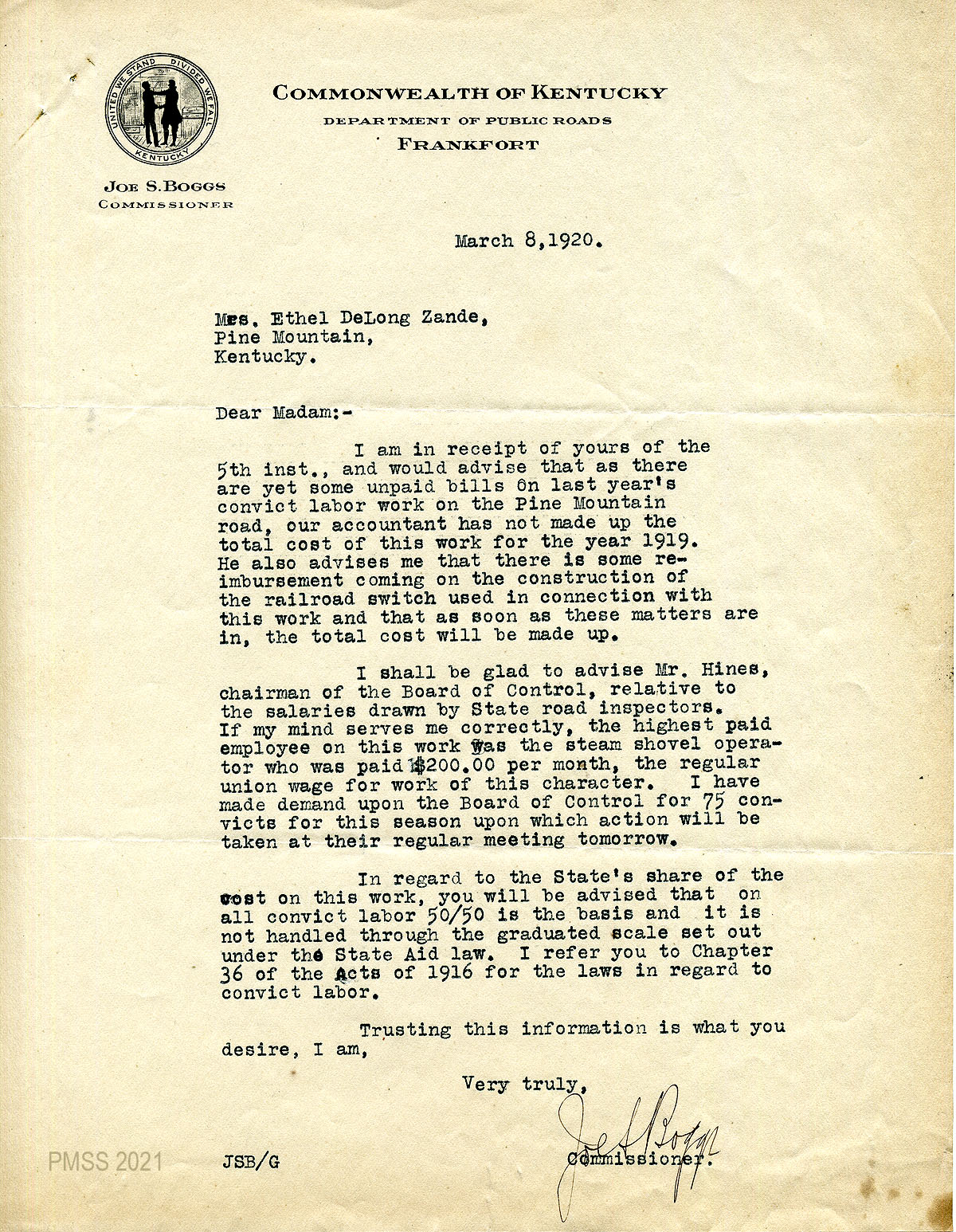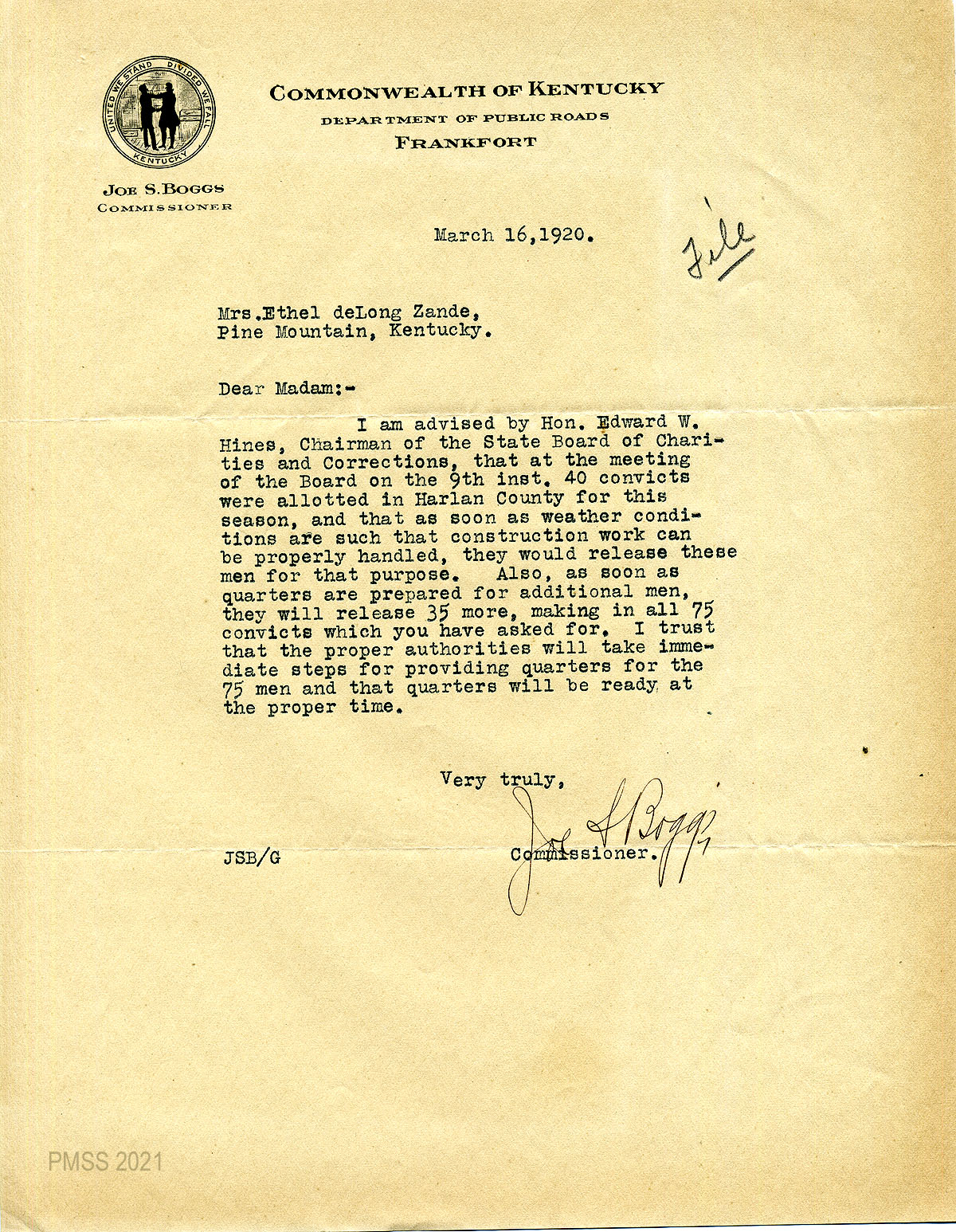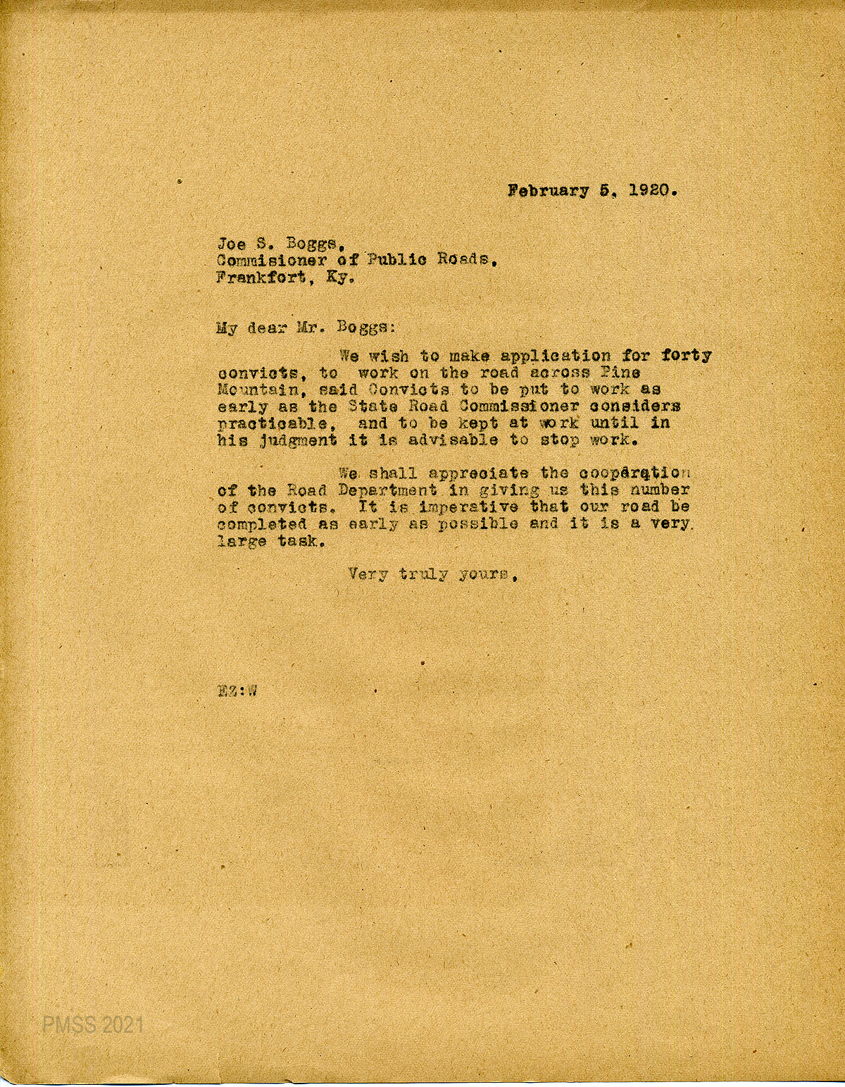 35 February 5, 1920. To Joe S. Boggs, Commissioner of Public Roads, Frankfort, Ky, from EZ (Zande), applying for 40 convicts “to work on the road across Pine Mountain.”