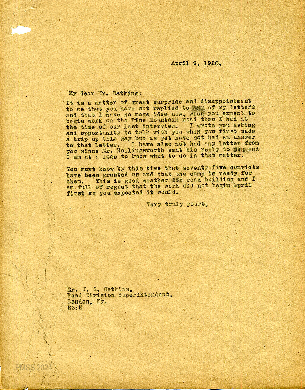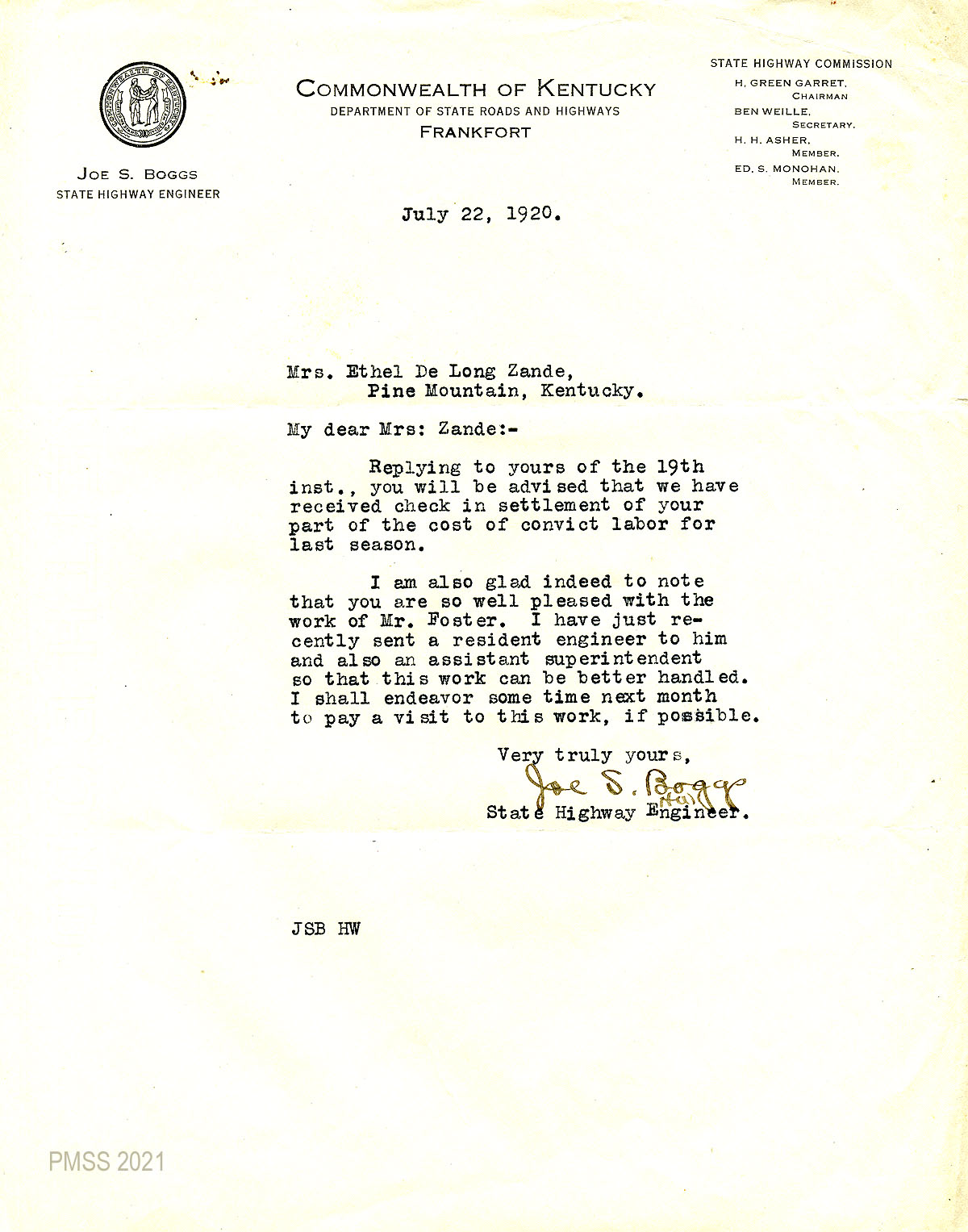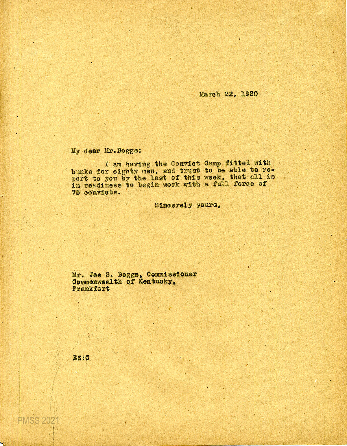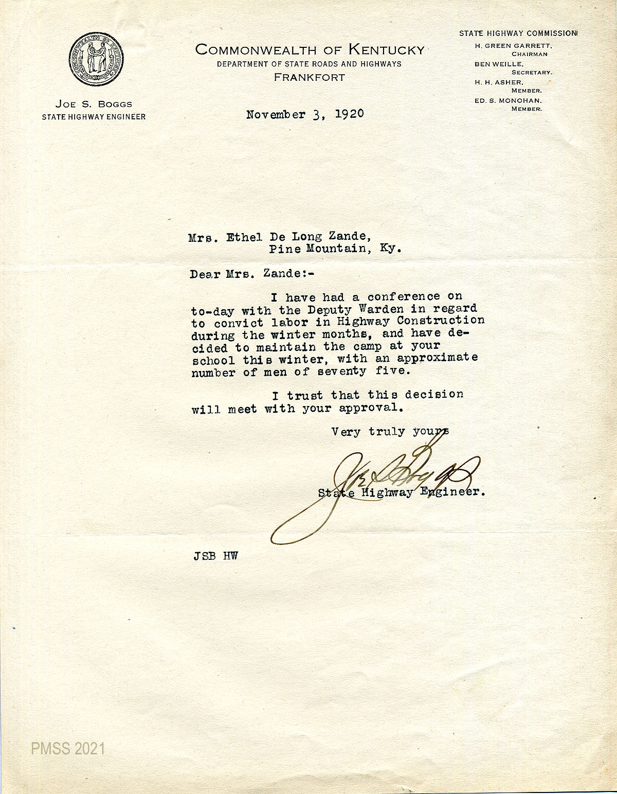 35 February 5, 1920. To Joe S. Boggs, Commissioner of Public Roads, Frankfort, Ky, from EZ (Zande), applying for 40 convicts “to work on the road across Pine Mountain.”