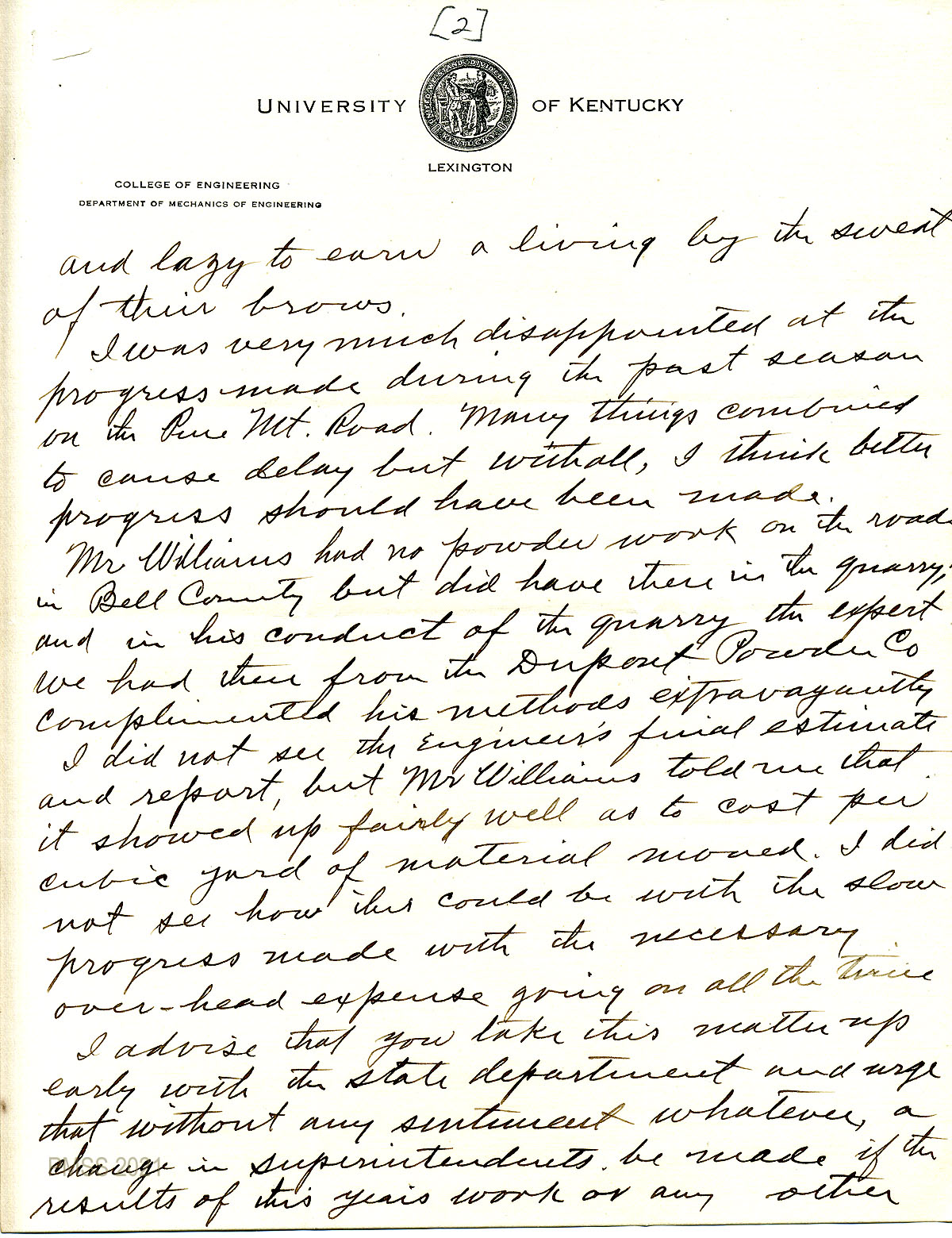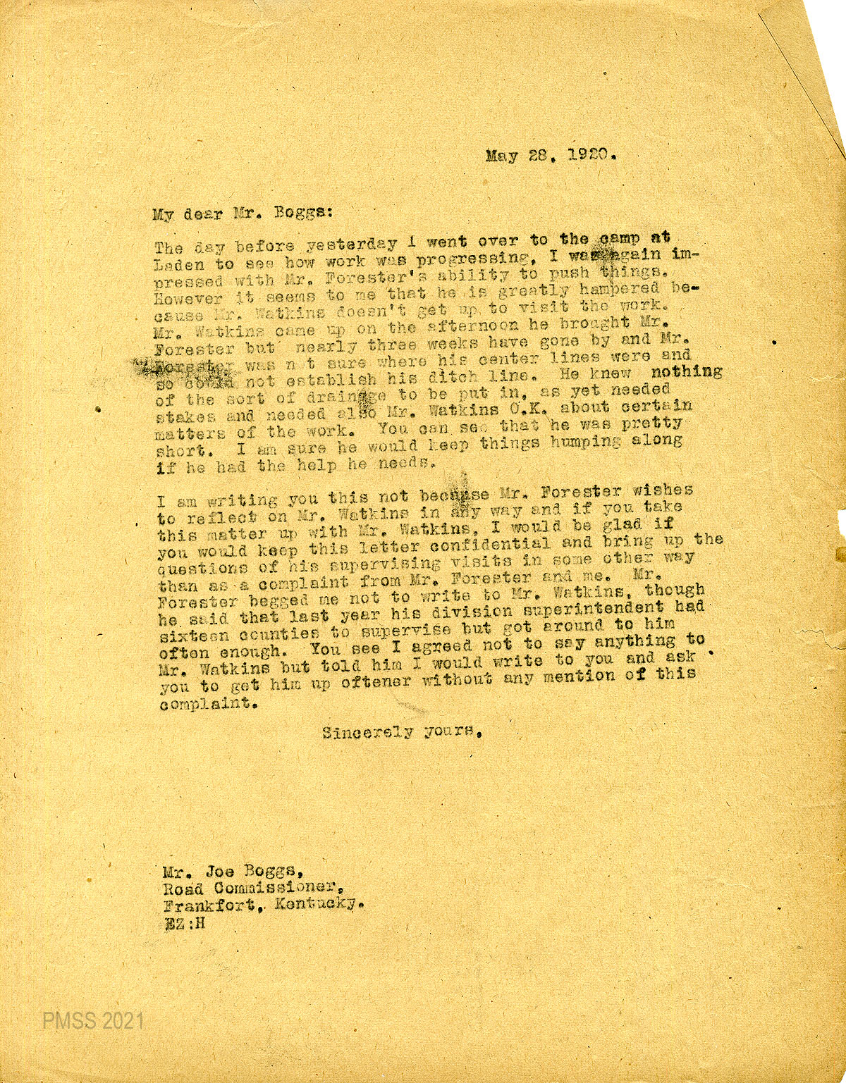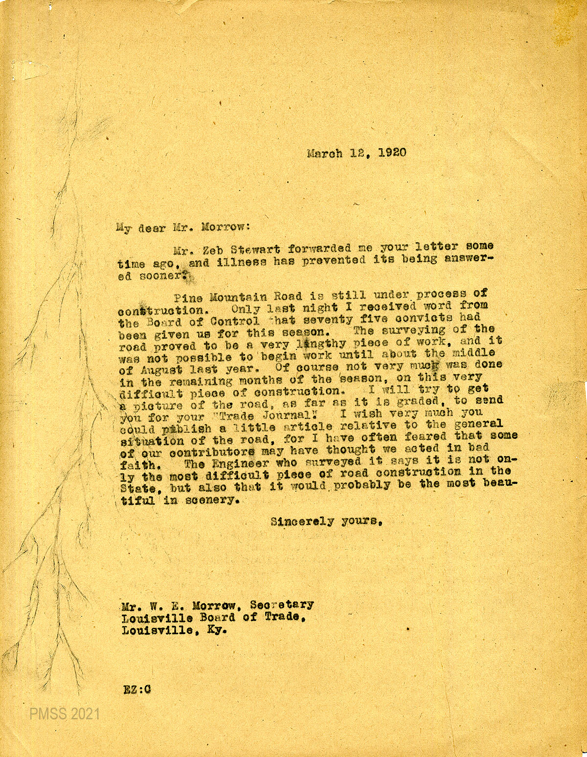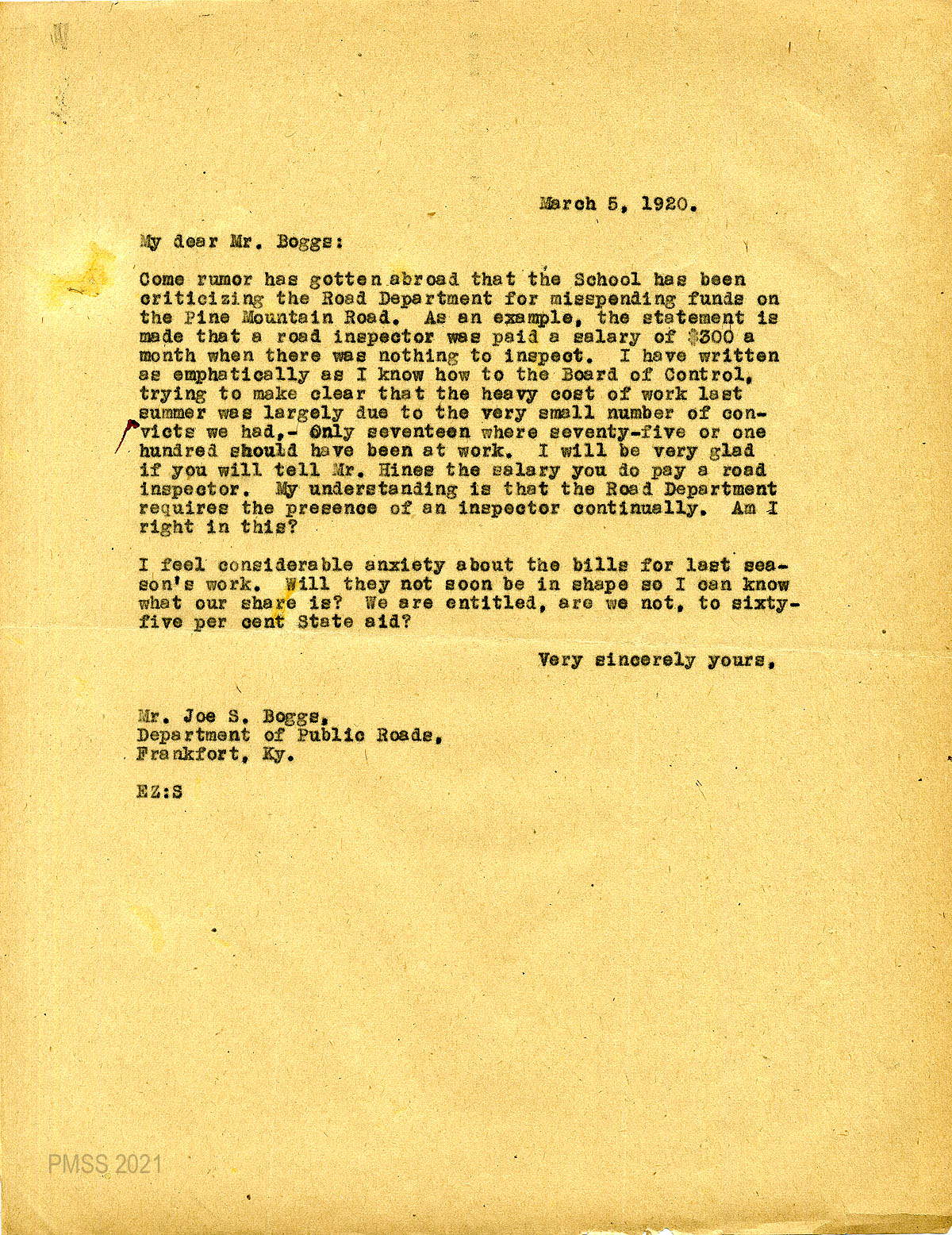 35 February 5, 1920. To Joe S. Boggs, Commissioner of Public Roads, Frankfort, Ky, from EZ (Zande), applying for 40 convicts “to work on the road across Pine Mountain.”