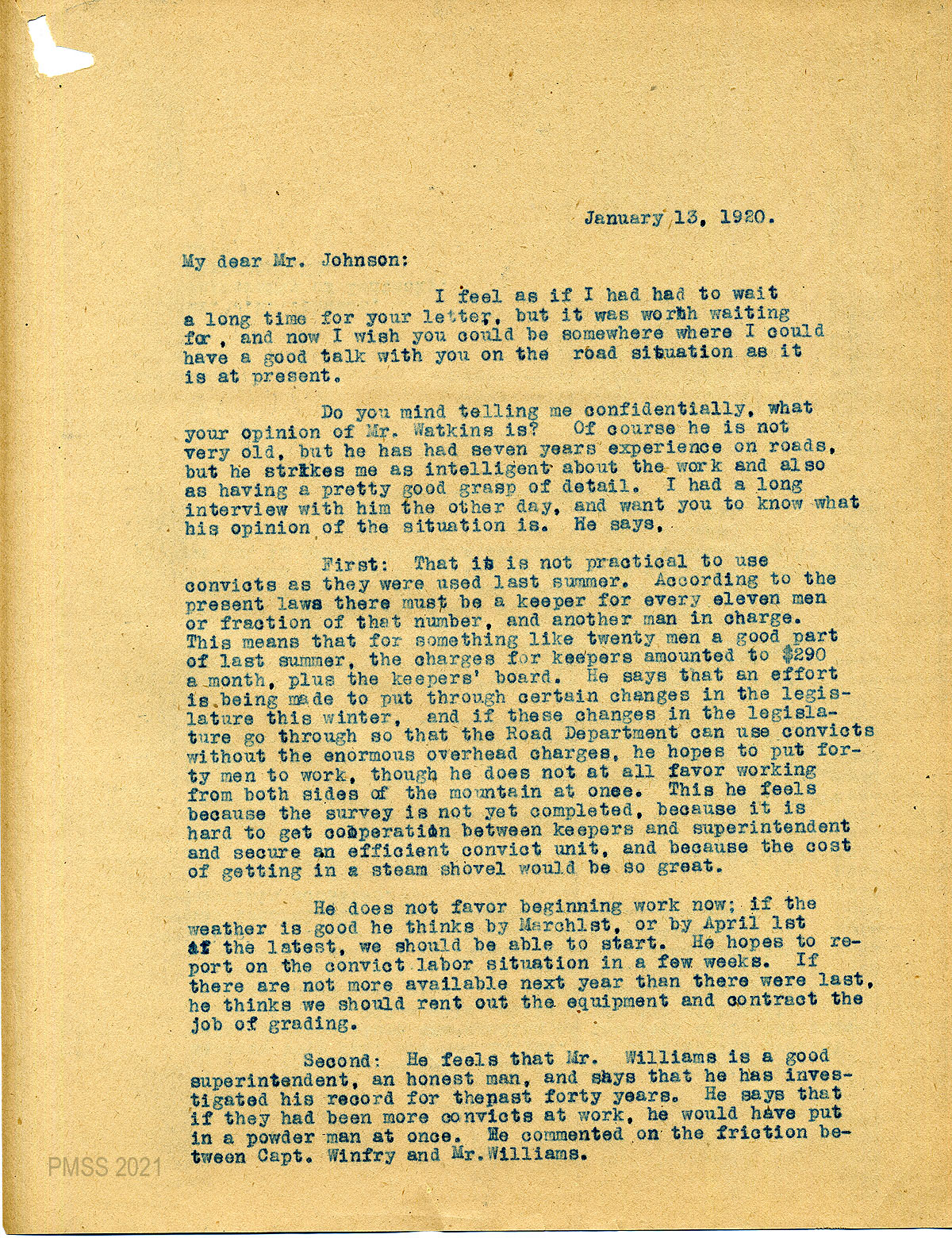 08 – 09 January 13, 1920. Two-page letter to Johnson from EZ (Zande), [08] asking his opinion of Mr. Watkins, “who has seven years experience on roads [and] who strikes me as intelligent about the work and also as having a pretty good grasp of detail.” She lists several points that Watkins made in a recent interview with her about prison labor in the summer, when to begin work, the friction between Capt. Winfrey and Mr. Williams, [09] the cost of grading per mile, and the need for detailed estimates. She asks his opinion on these issues.
