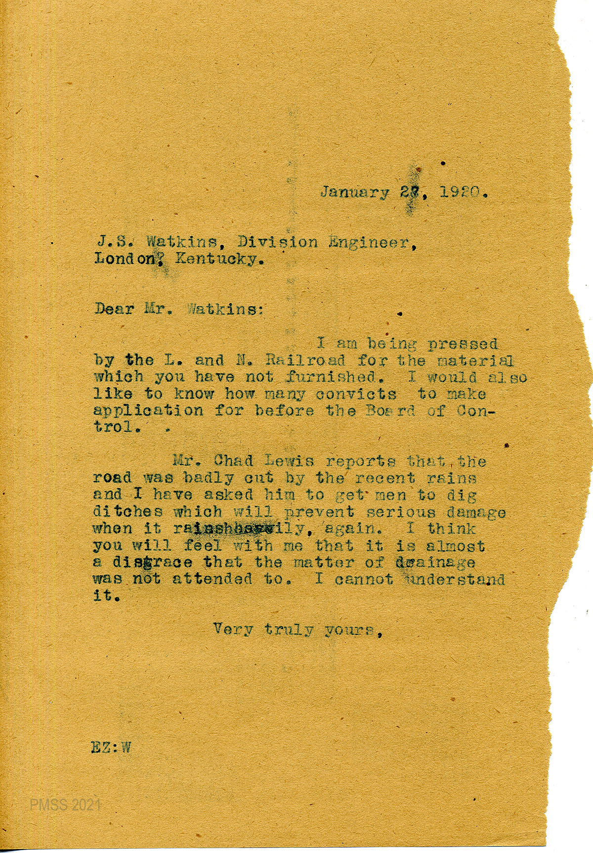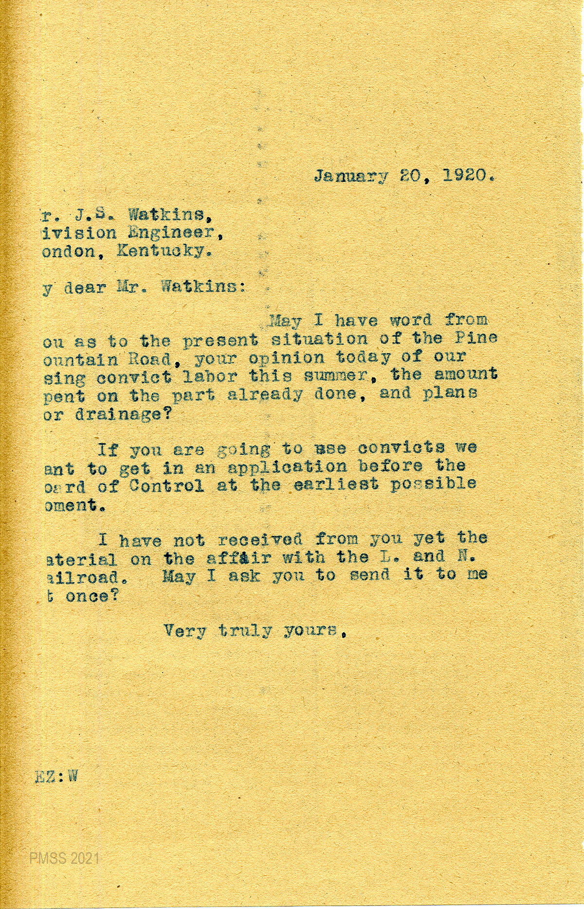 12 January 20, 1920. To Watkins from EZ (Zande), asking her for information about the road, convict labor for the summer, the amount spent so far, and drainage plans. Requested material on the “affair with the L. and N. Railroad.”