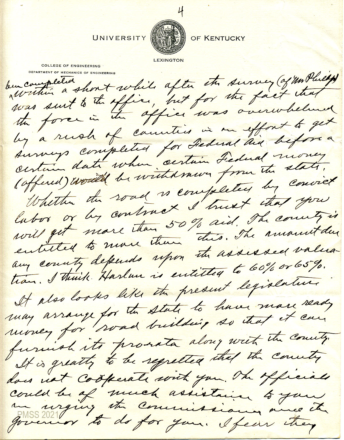 22 – 26 January 30, 1920. Five-page handwritten letter to Zande from Johnson, replying to her letter. [22] Explains that the cost of convict labor using state funds is in excess of convict labor by contract (when the county/school’s share is reimbursed by the state). [23] “Prison labor is costly simply because it is managed by the state and not by an individual (contractor) who makes or loses according to the efficiency of the management.” [24] He agrees with Watkins’ estimate of Williams. There is not enough money to surface the road, but the road can be useful with a hard surface. He explains why the estimate and drainage plans were delayed; [25] He assures Zande that with or without contract labor, she will get more that 50% aid and explains how this is assessed. Regrets that the county is not cooperative with Zande. [26] He mentions plans for a Harlan-Hindman road. Suggests she use “friends with political influence.” He feels that “Whatever service you render for the success of this road is a service for the state.”
