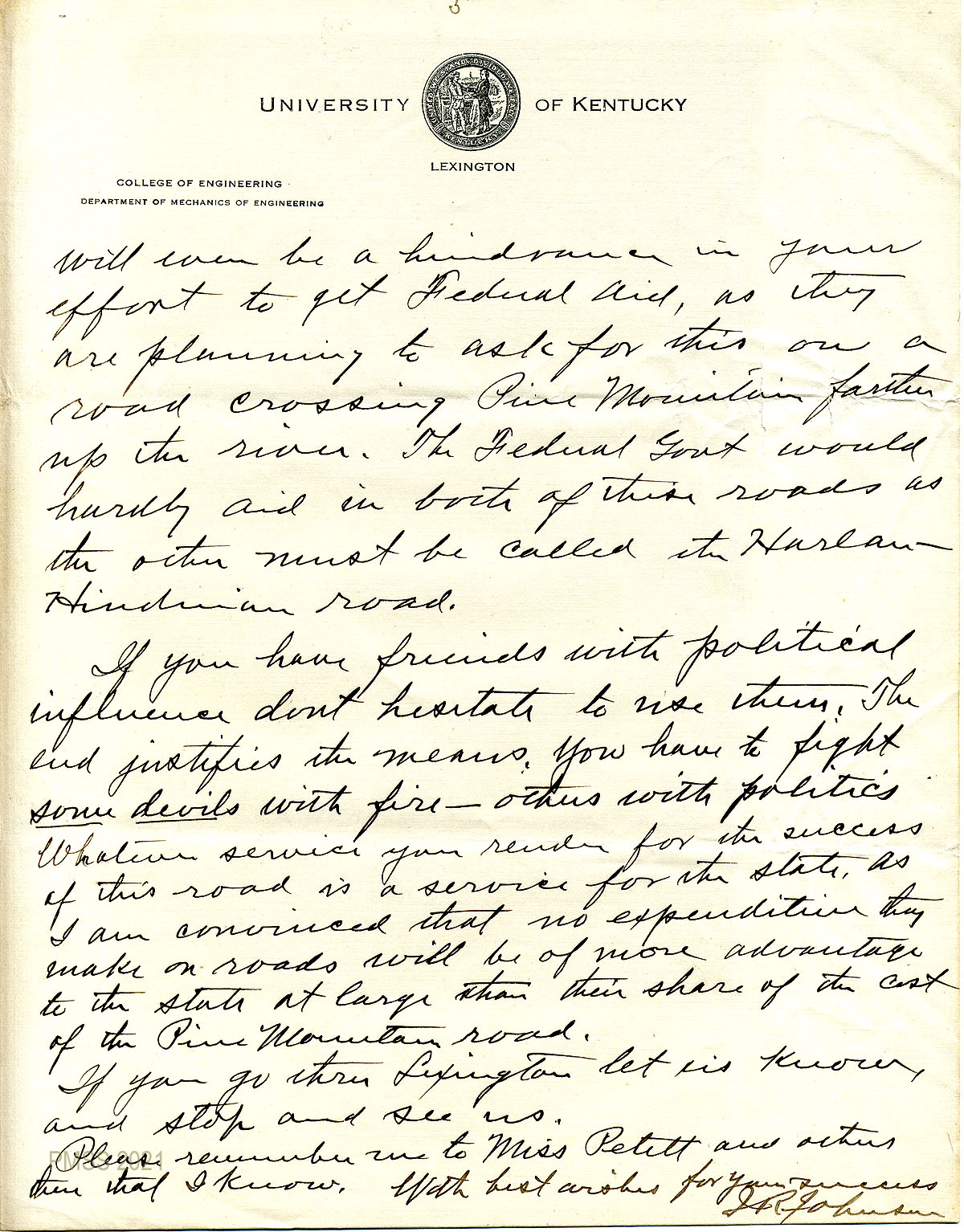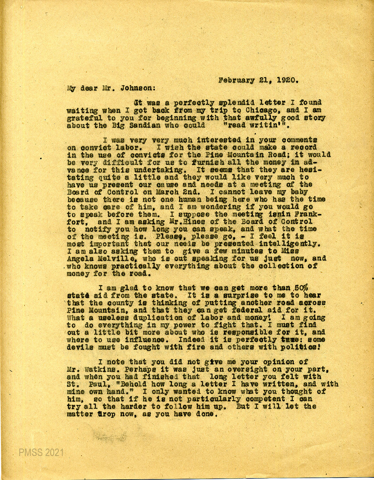 48 February 25, 1920. To Zande from Hines, responding to her request that Johnson and Melville be permitted to talk before the Board about the Pine Mountain Road. The Board welcomes them, but “this is a matter which should be taken up with the Department of Public Roads, rather than with the Board of Control….” The Board is only responsible for the convicts’ supervision and welfare. He clarifies his letter of February 24.