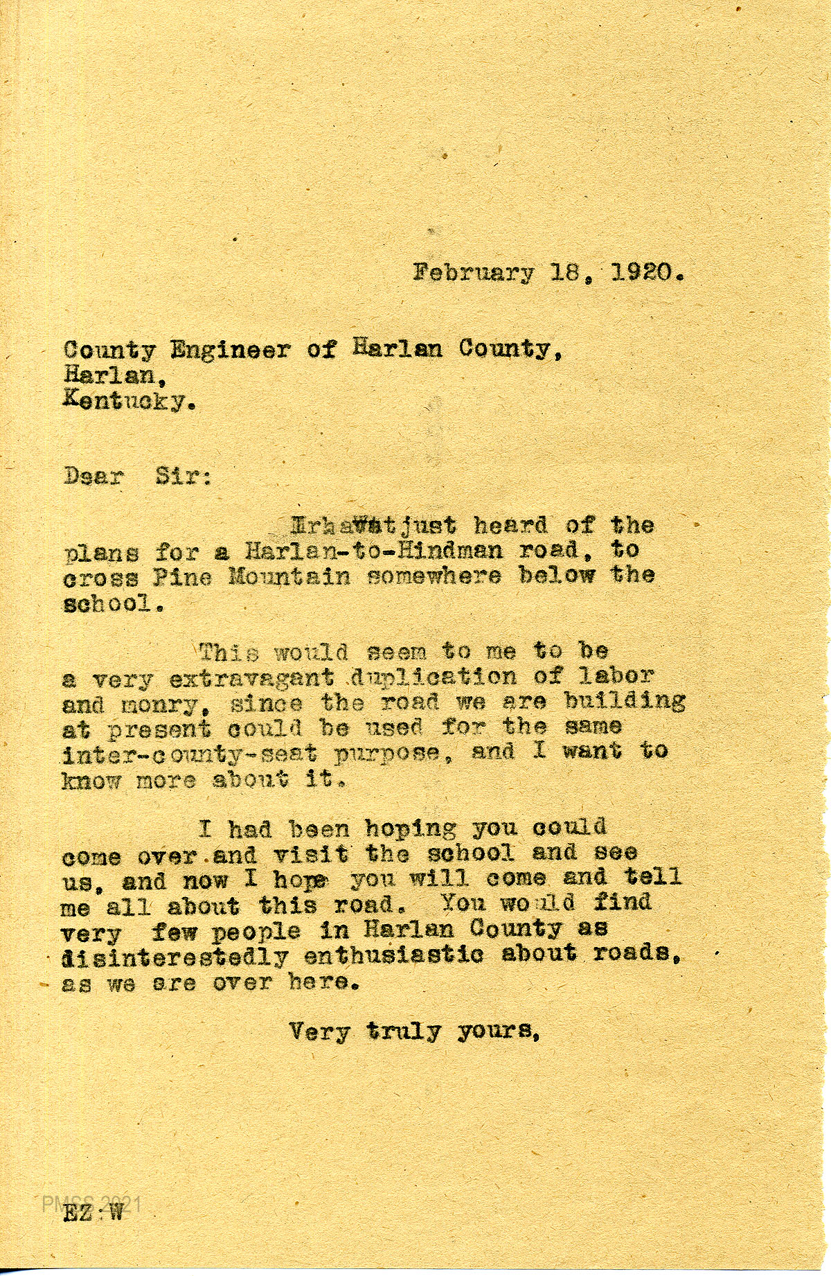 41 February 18, 1920. To County Engineer of Harlan County from EZ (Zande). Zande would like to hear more about the Harlan-to-Hindman road, which she feels is “a very extravagant duplication of labor and money, since the road we are building at present could be used for the same inter-county-seat purpose….”