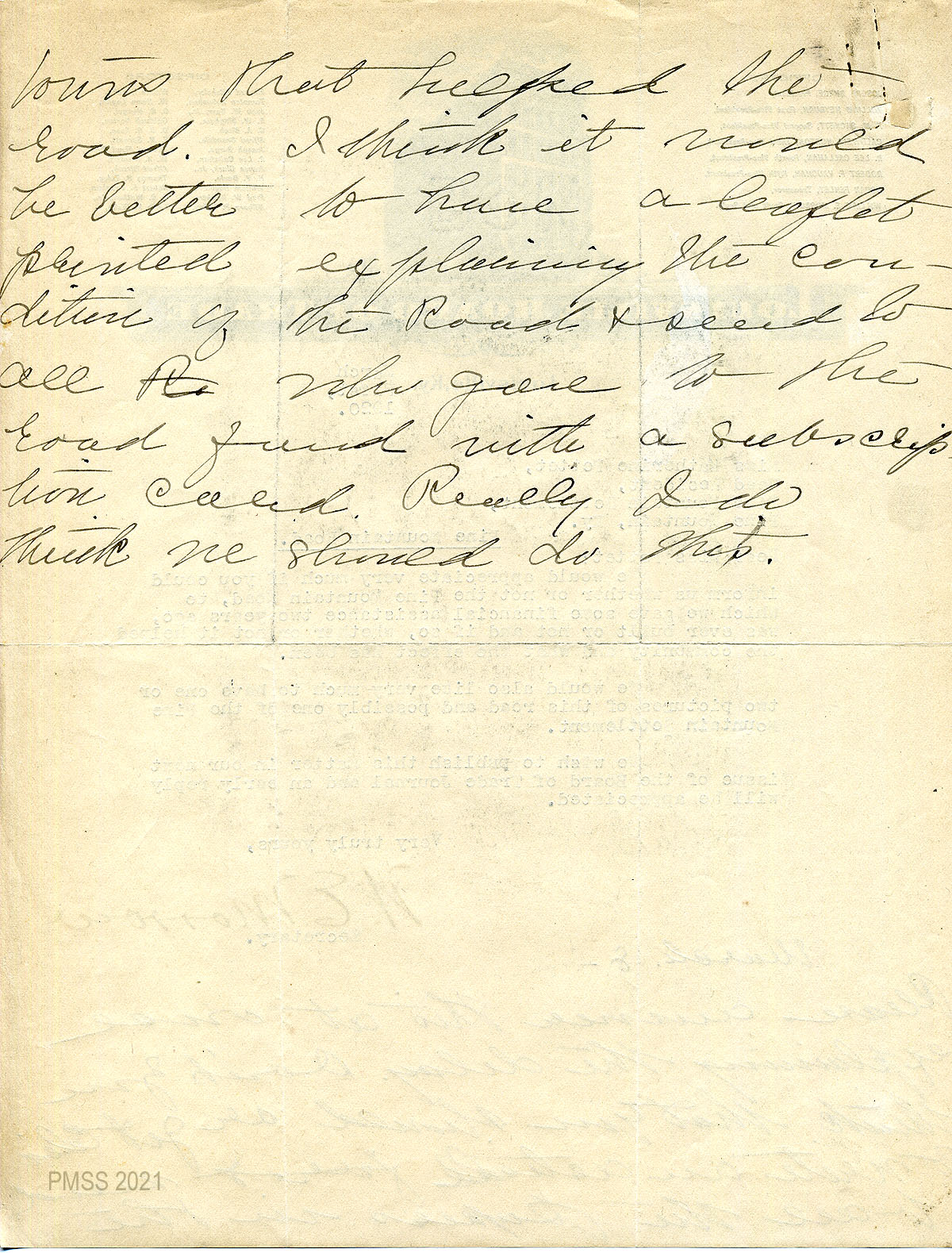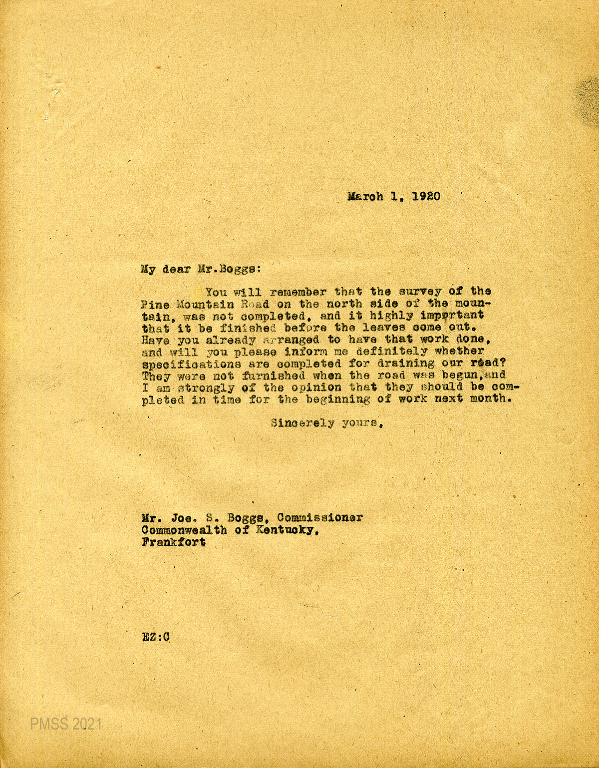 51 March 1, 1920. To Boggs from EZ (Zande), asking him to see that the survey of the Pine Mountain Road on the north side is completed ‘before the leaves come out.” Asks for specifications for draining the road.