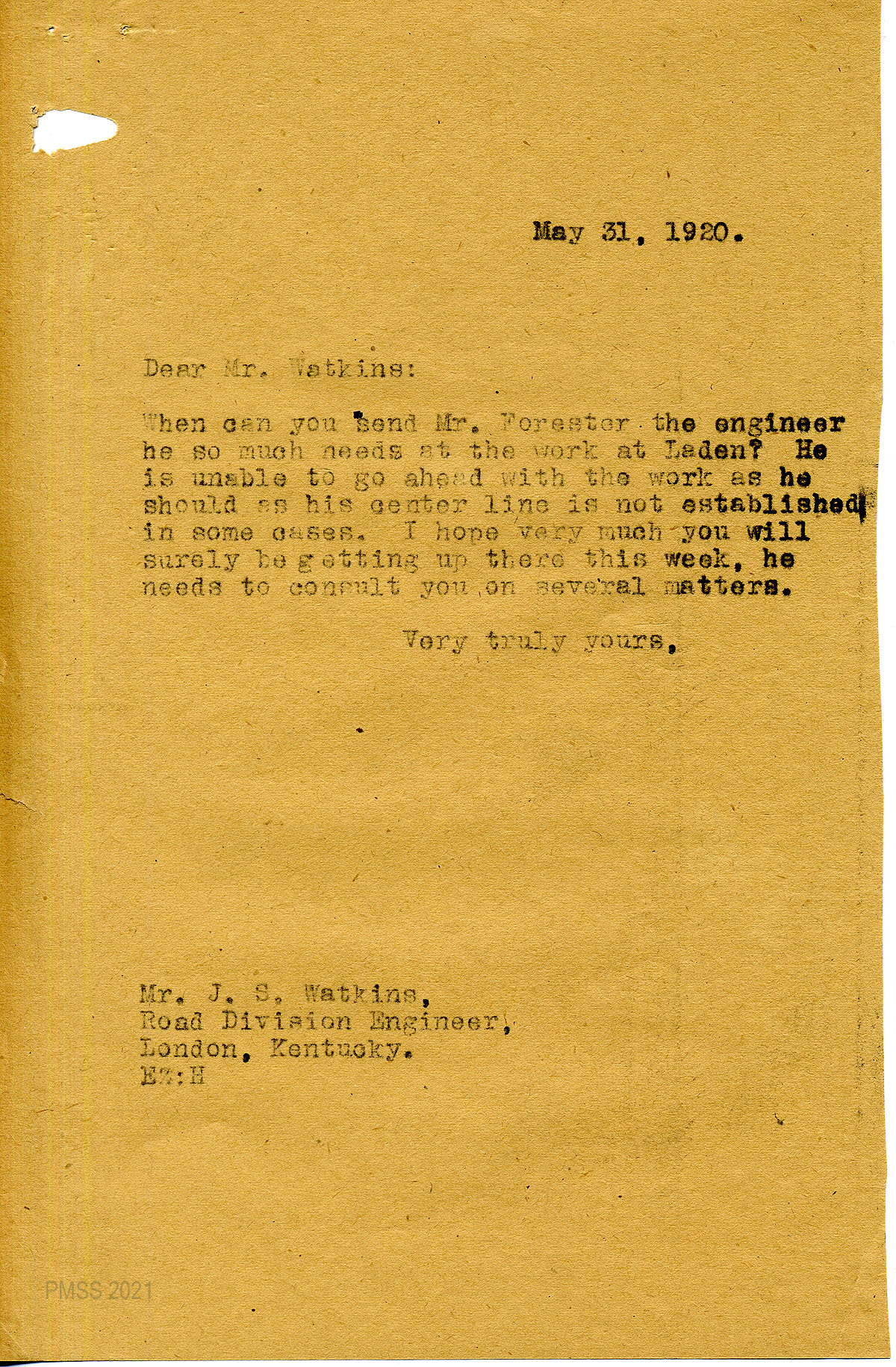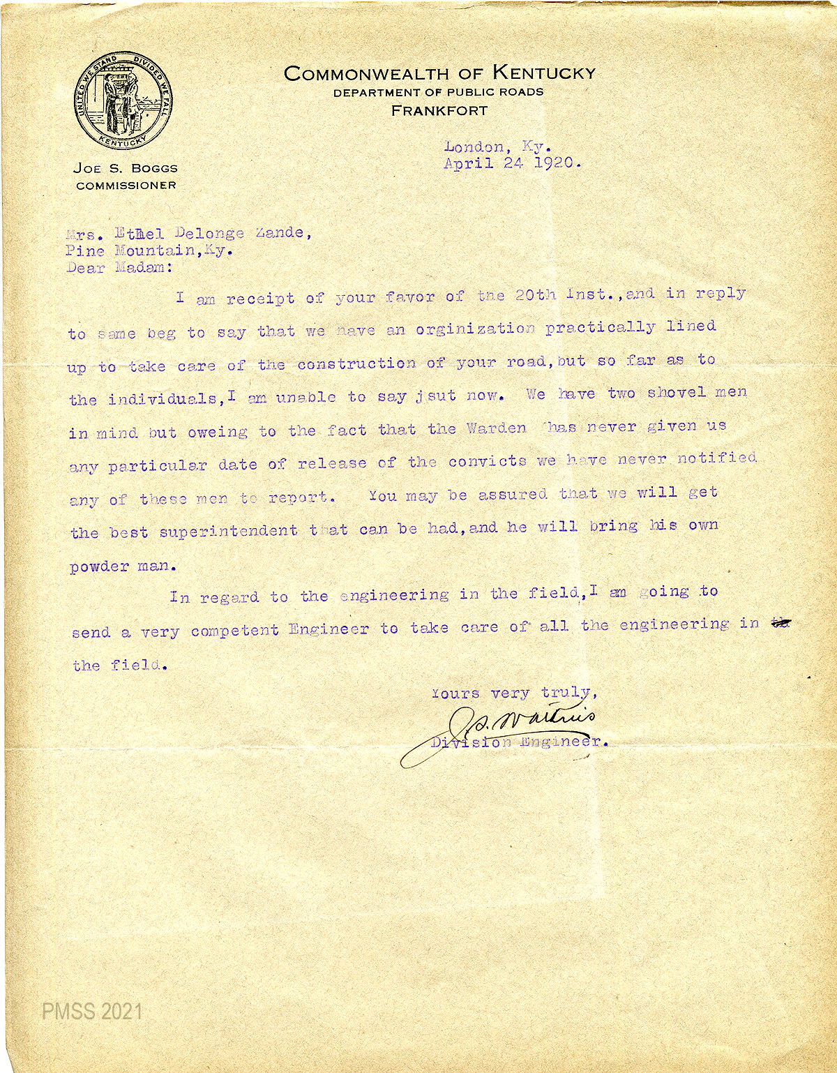 J.S. Watkins – J.R. Johnson’s successor as Division Engineer, Convict Labor Fund for Bell County, Kentucky Department of Public Roads, London, Ky.