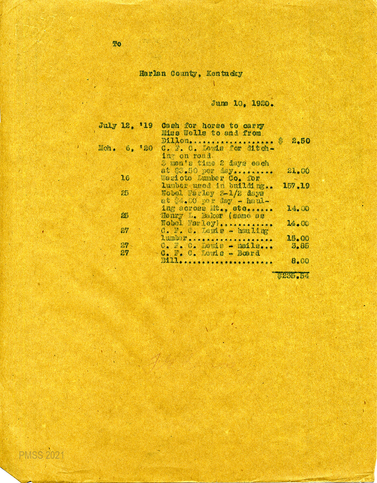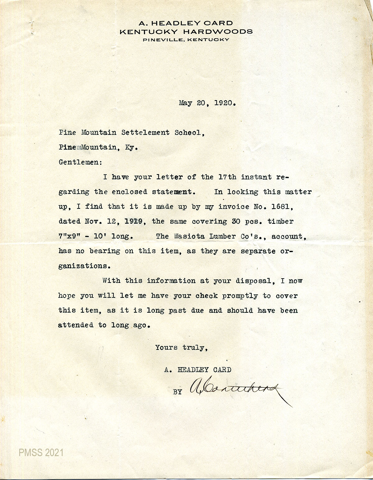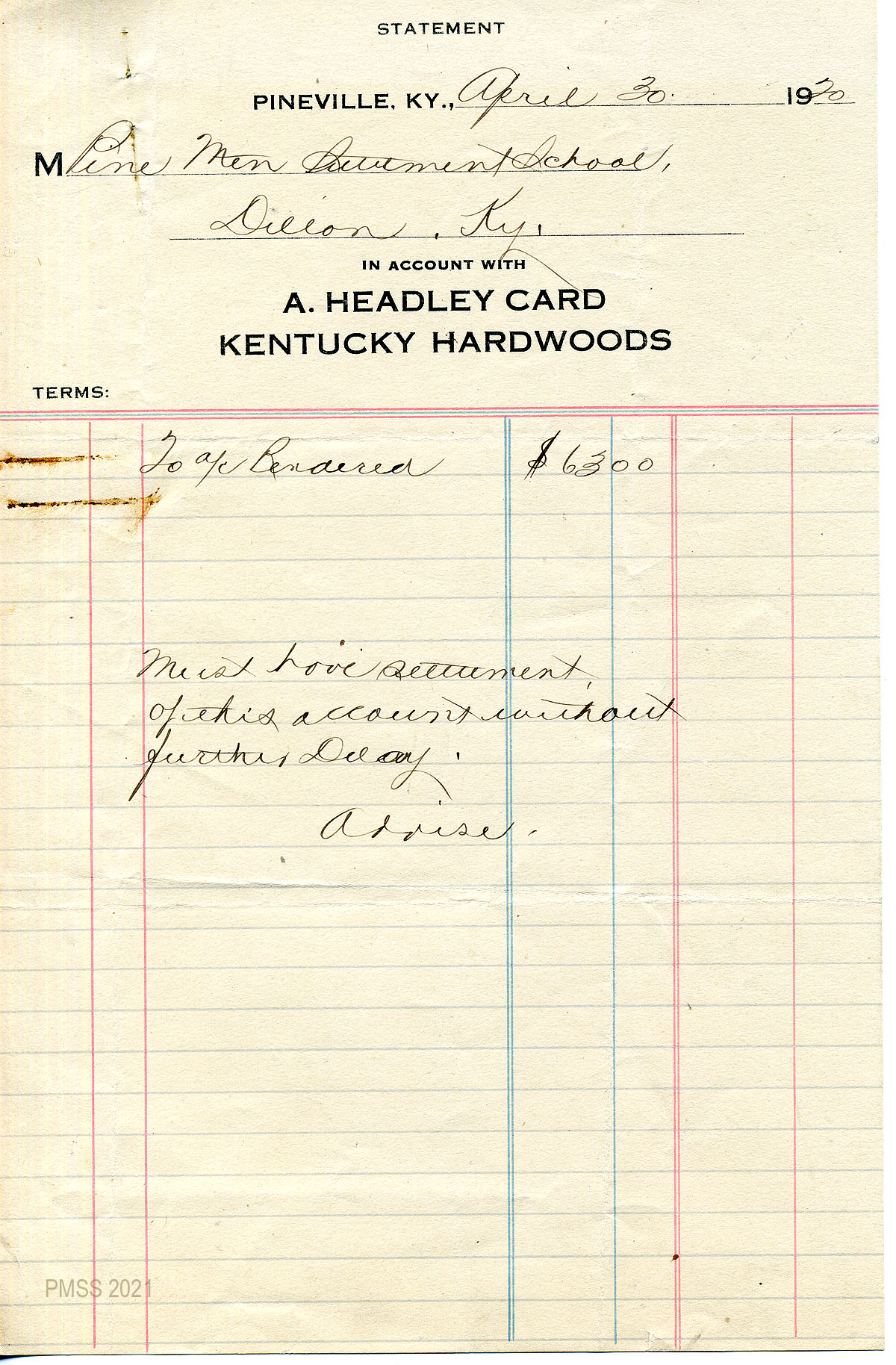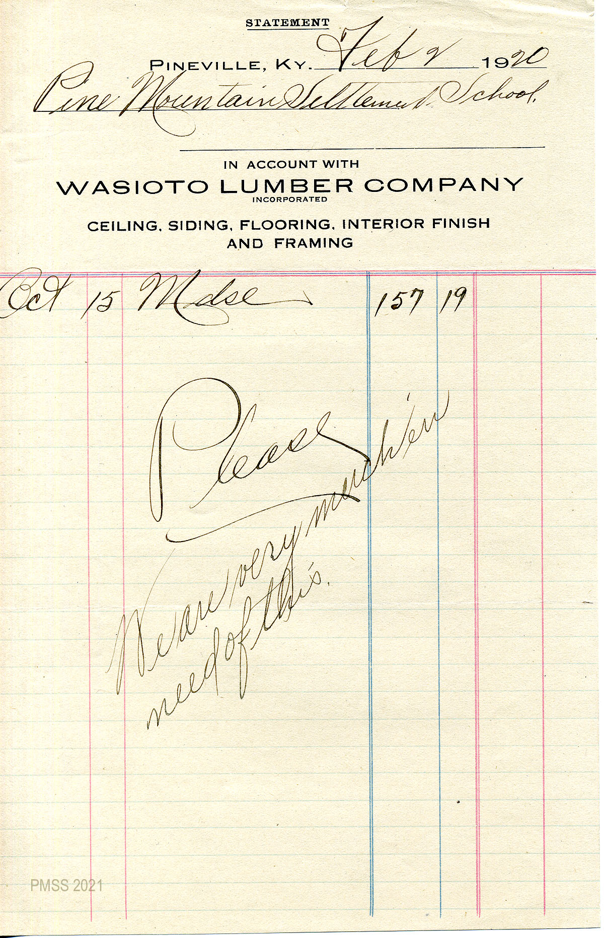 29 February 2, 1920. A statement for PMSS’s purchase of “mdse” on October 15, from Wasioto Lumber Co., Inc., Pineville, Ky.