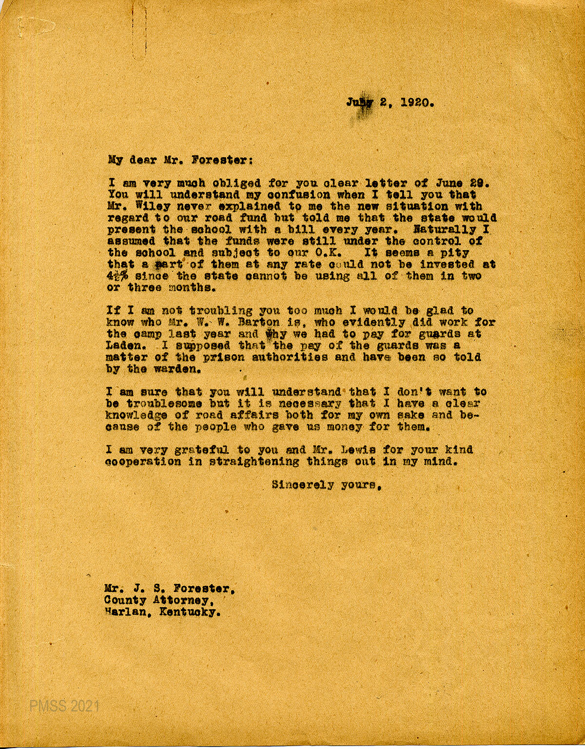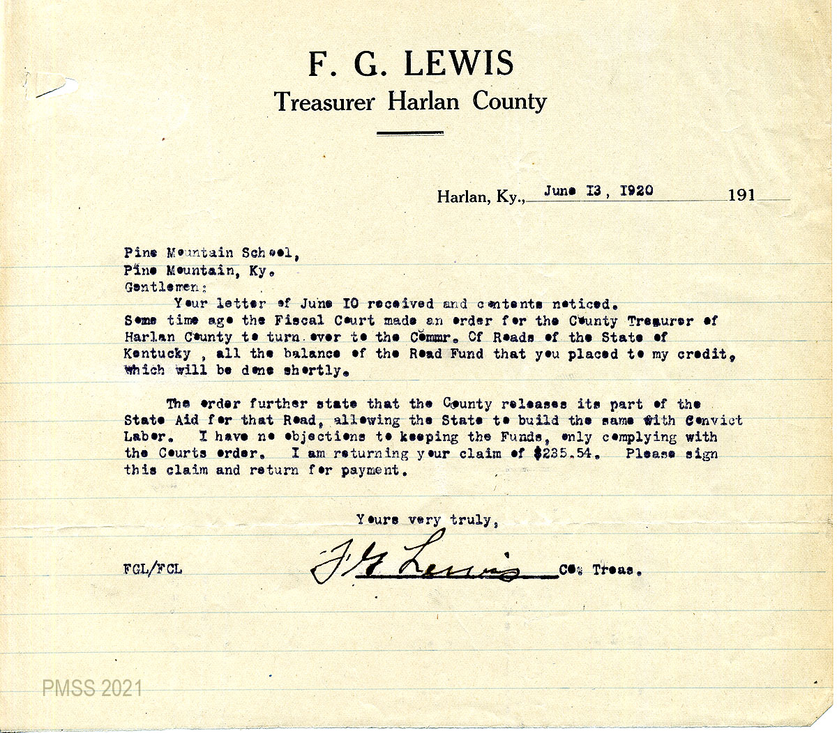 F.G. Lewis – County Treasurer, Harlan, Ky.