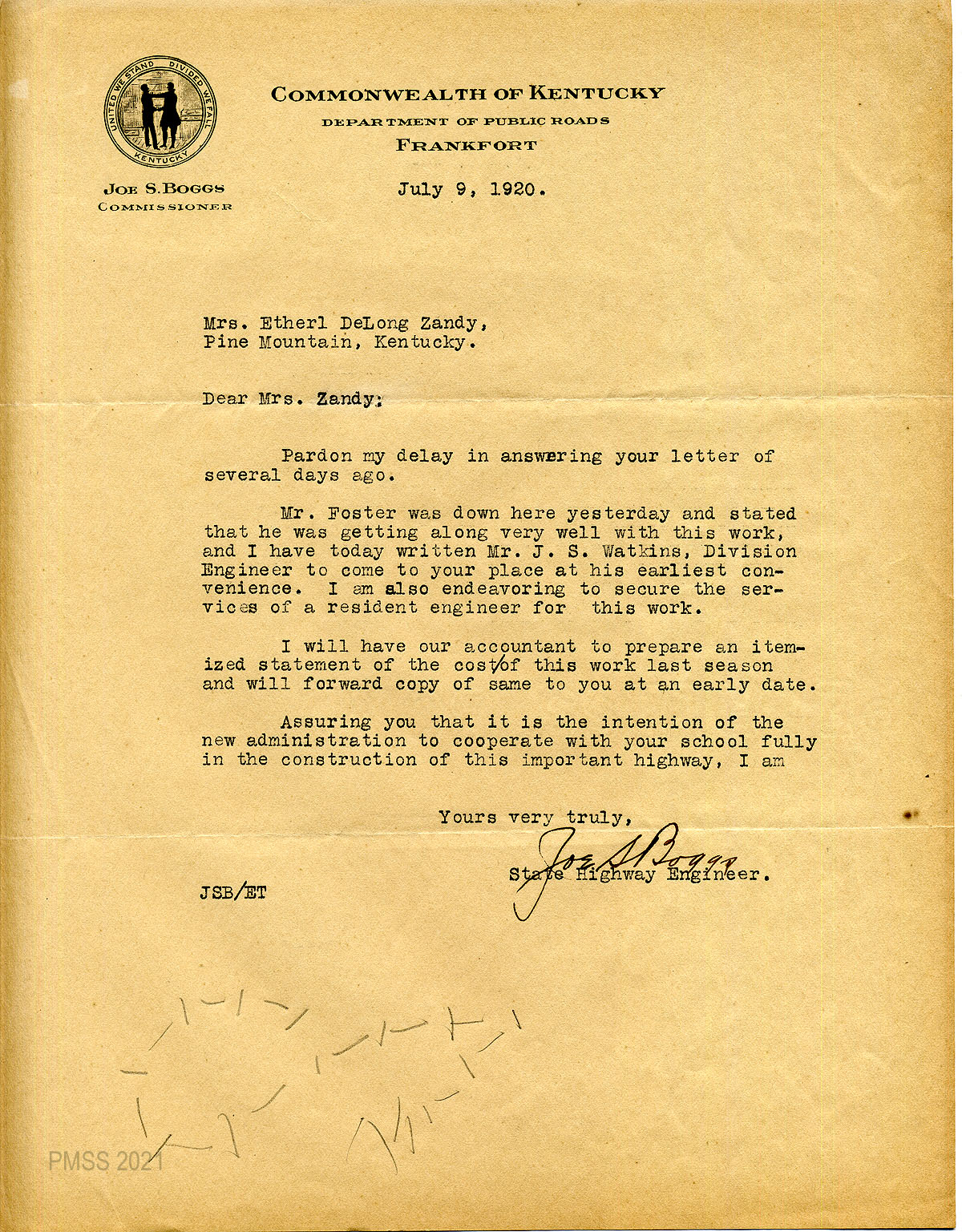 11 January 19, 1920. To Zande from Watkins, Division Engineer, Kentucky Department of Public Roads, London, Ky. Mr. Joe S. Boggs, Commissioner, told him about possible passing of legislation “to remedy Convict work.” He will send Zande the cost statements when they are ready.