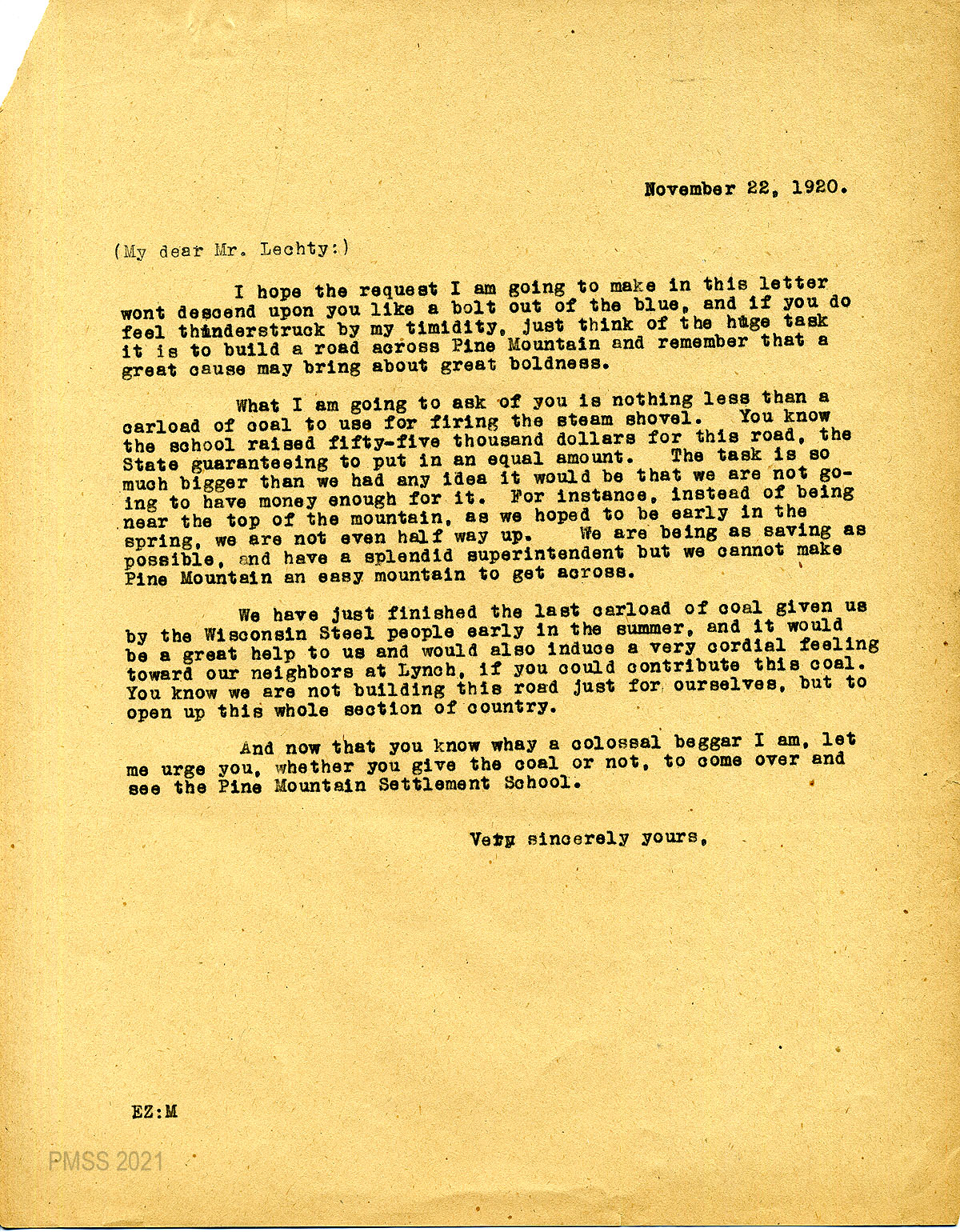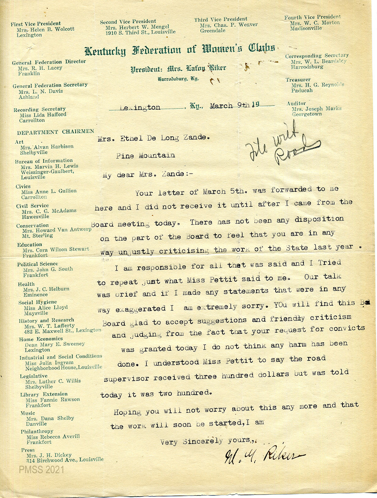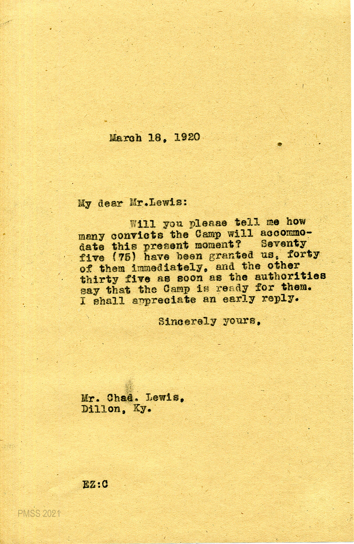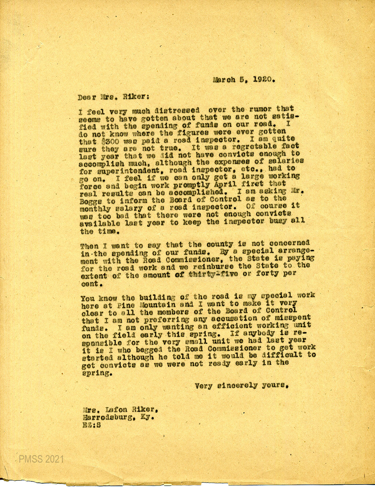 39 February 9, 1920. To Mrs. Lafon Riker, Board of Control of the State of Kentucky, Harrodsburg, from EZ (Zande), applying for 75 convicts to work on the road over Pine Mountain.