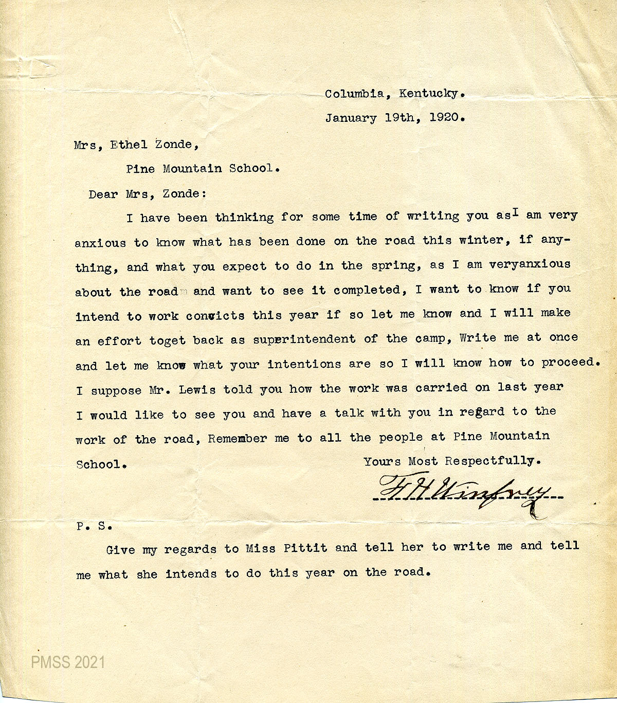 10 January 19, 1920. To Zande from F.H. Winfrey, asking for an update from her and Katherine Pettit on “what has been done on the road this winter, if anything…” and her plans for spring, particularly about convict labor.