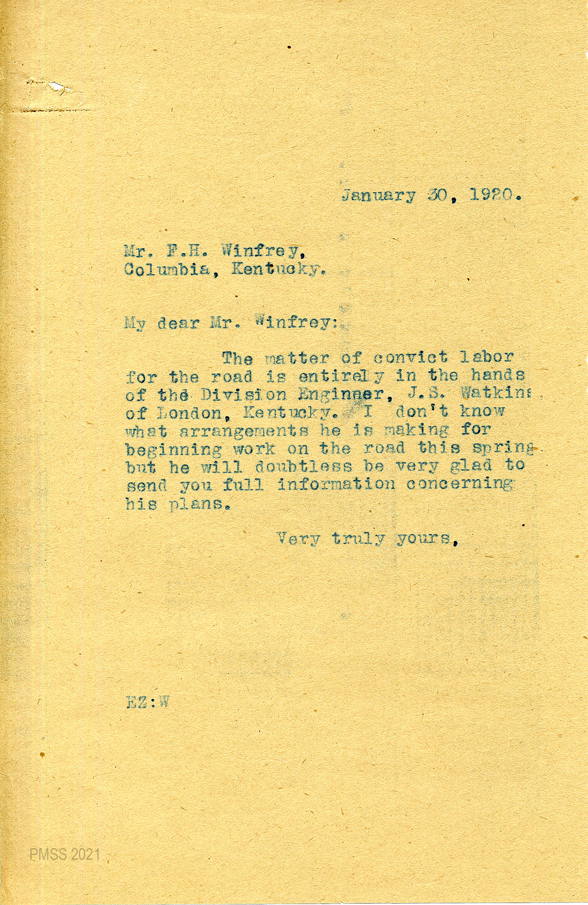 21 January 30, 1920. To Winfrey, Columbia, Ky., from EZ (Zande) who refers Winfrey to Watkins concerning convict labor for the road.