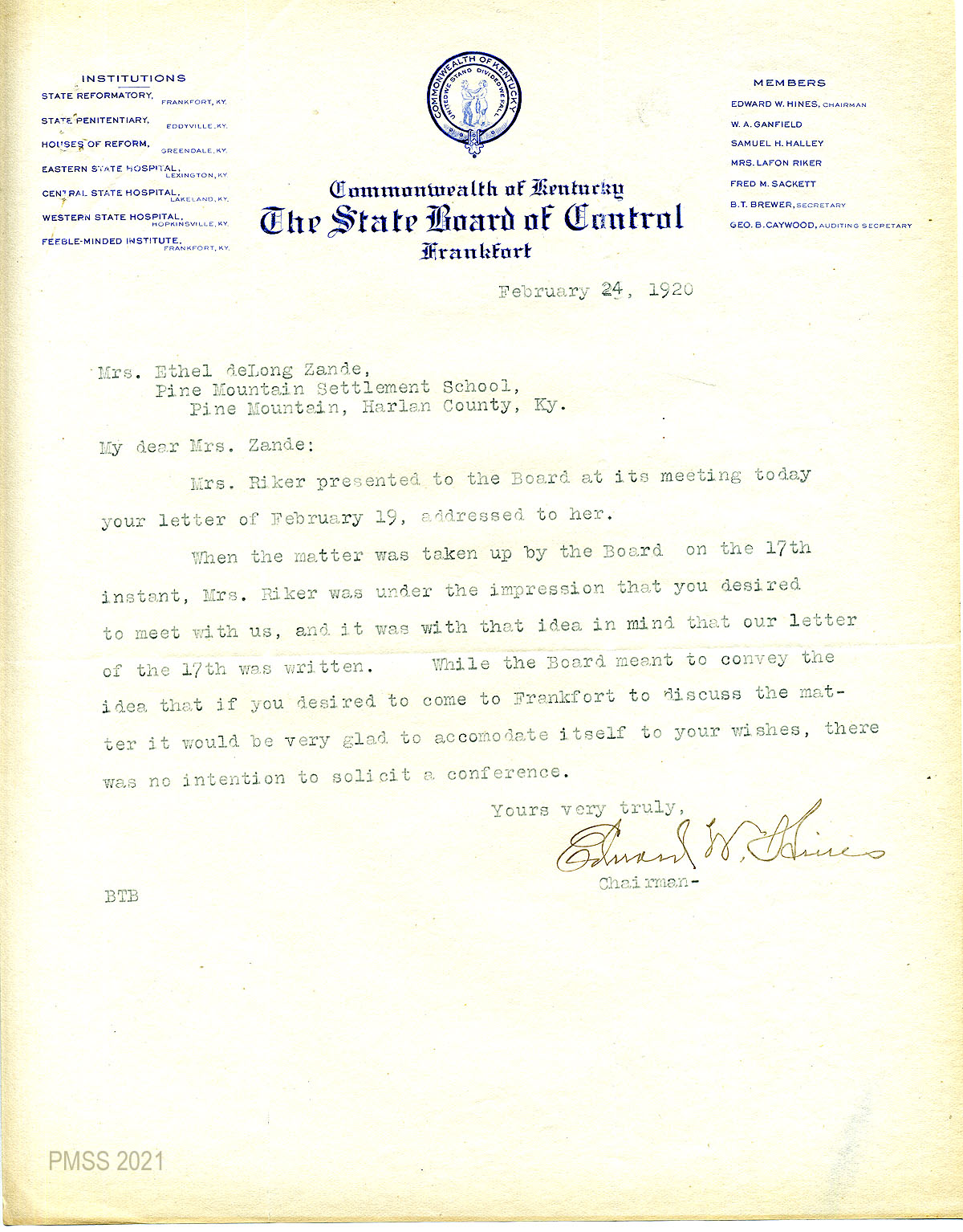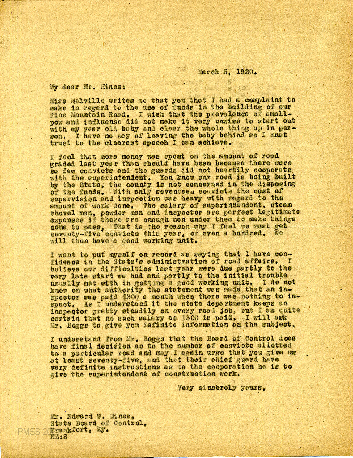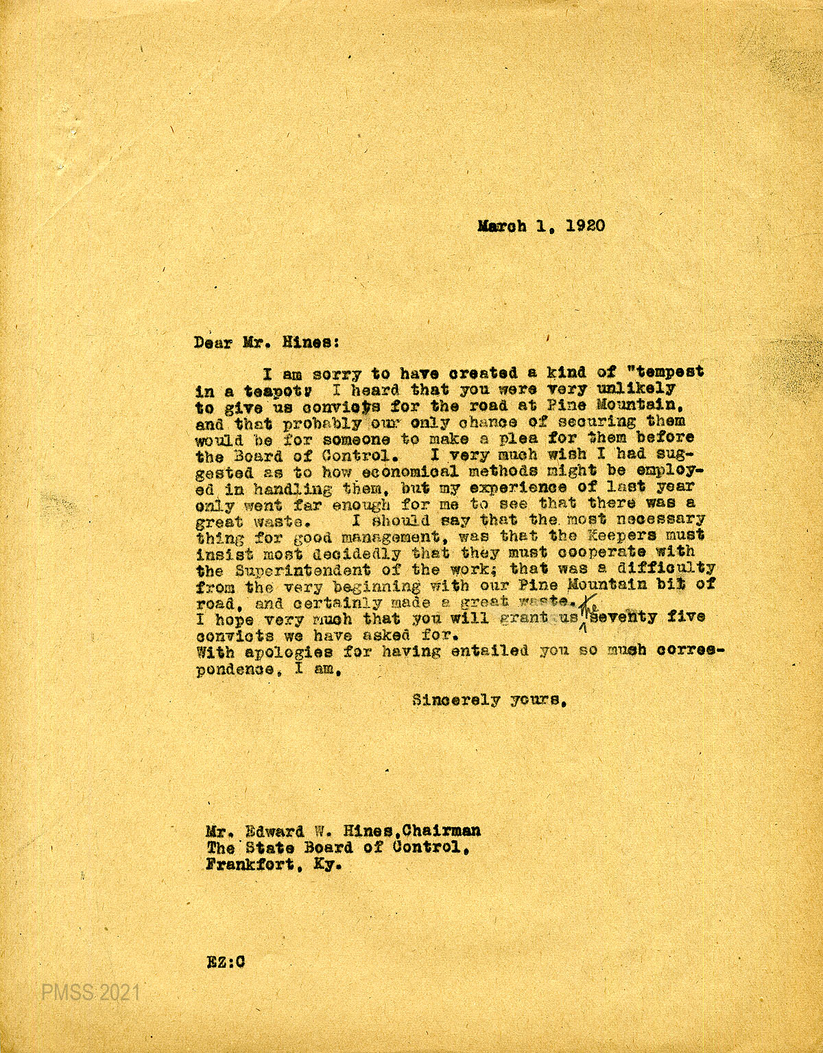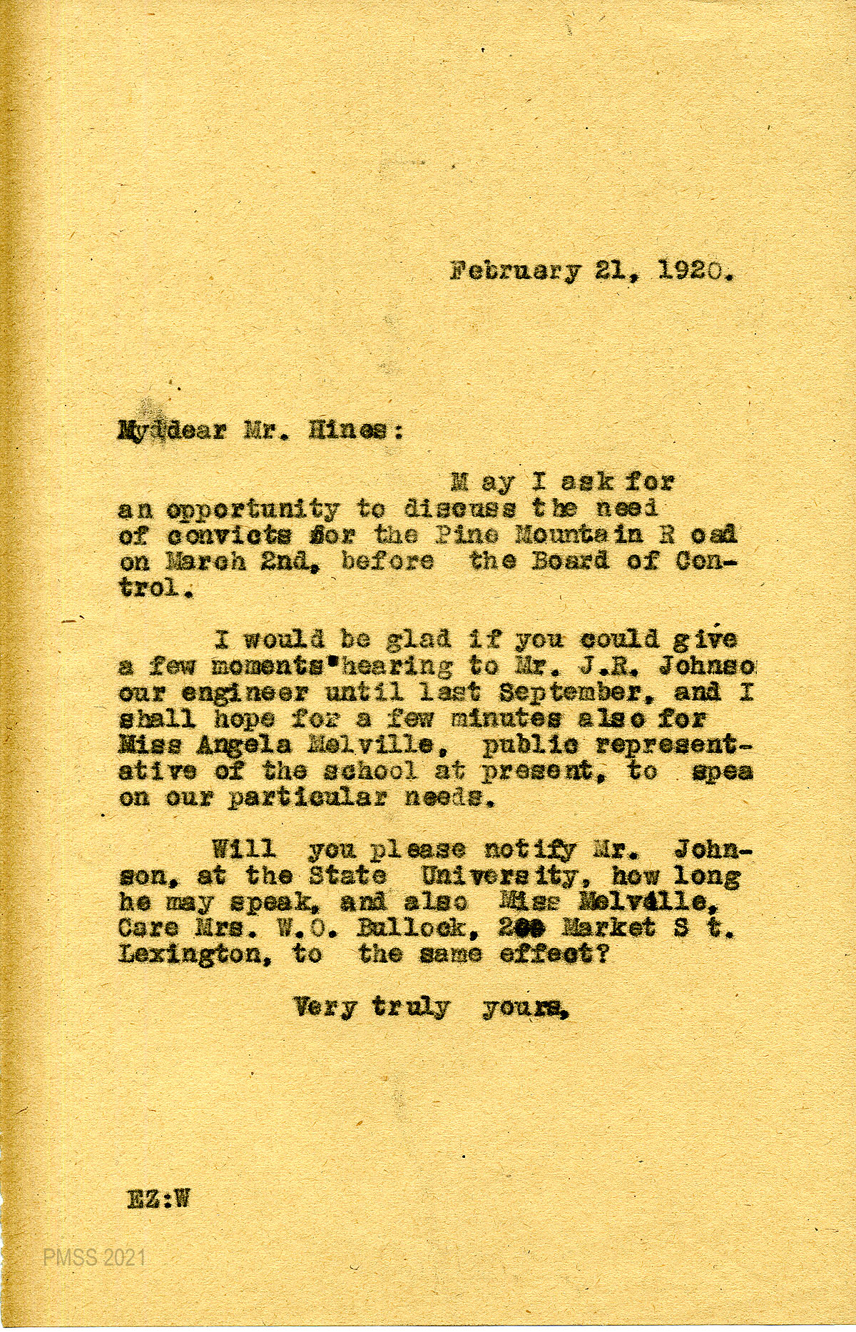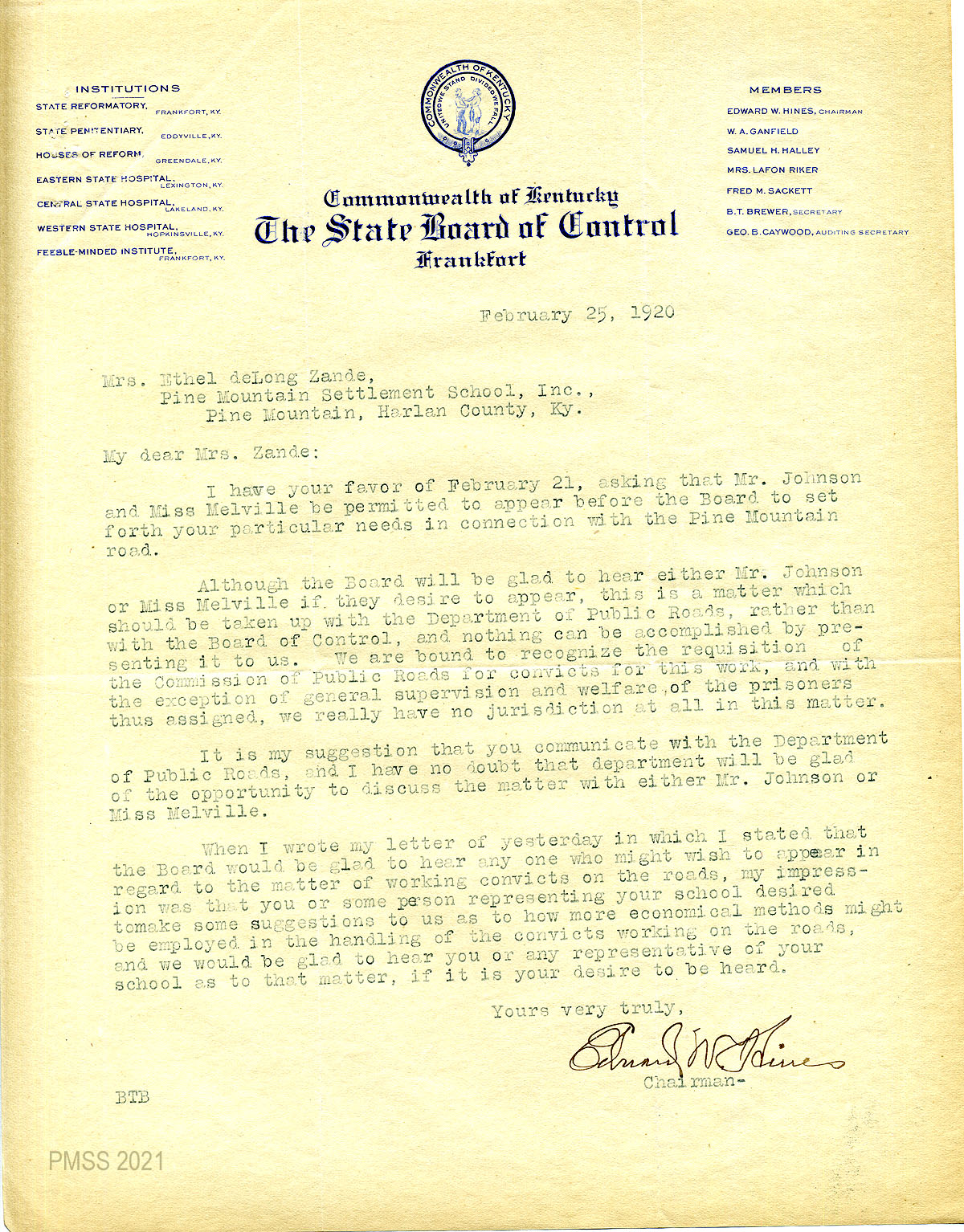 44 February 21, 1920. To Edward W. Hines, Chairman of the State Board of Control, Frankfort, from EZ (Zande), asking him to allow Johnson and Melville to speak before the Board of Control on the need of convicts for the Pine Mountain Road.