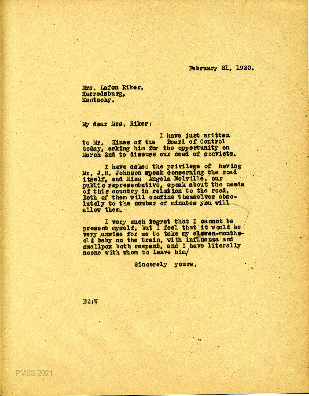 45 February 21, 1920. To Mrs. Riker from EZ (Zande), telling Riker that she is arranging with Hines to have Johnson and Melville to speak at the Board of Control meeting. She explains why she cannot be present, mentioning her 11-month-old baby and that influenza and smallpox are “rampant.”