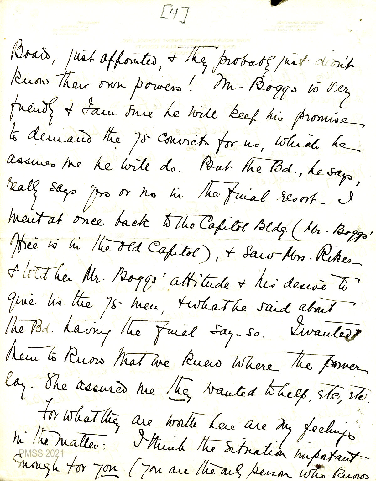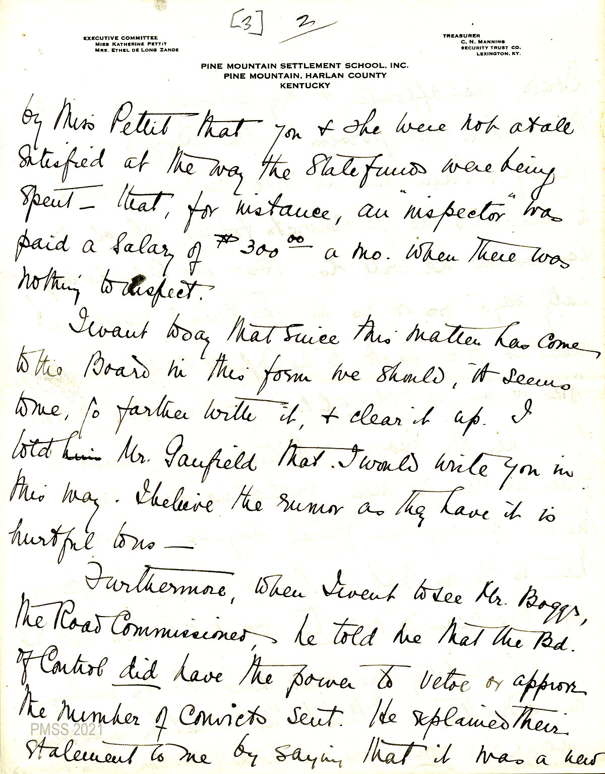 54 – 59 March 2, 1920. Six-page handwritten letter to Zande from (signature is truncated, apparently Angela Melville), YWCA Home, Lexington, Ky., [54] reporting on her visit with the Board of Control Frankfort to tell them about “our great need of the convicts.” Members of the Board were Mrs. Riker, Mr. Hines, Mr. Garfield, the Secretary Mr. Brewer, and another man. She was told that “the Board had not the power to appropriate the number of convicts — this matter being in the hands of Mr. Boggs, the Road Commissioner.” Also, the Board would look into PMSS’s dissatisfaction “with the way the County was dispensing [55] the funds….” Surprised that the Board knew about this, Cathcart [56] explains how they found out (via Pettit to Riker). Cathcart suggests that Zande write to them and “clear it up.” Later, Boggs told Cathcart that the Board of Control “did have the power to veto or approve the number of convicts sent.” [57] He explained that it was a “new Board, just appointed, & they probably just didn’t know their own powers!” He assured Cathcart that he will get the 75 convicts for the road. Cathcart lists her own feelings concerning the situation: [58] She feels Zande should meet with the Board. The rumor about poor spending of the funds has “got under [their] skin” and may hurt the chances of getting cooperation from them. [59]