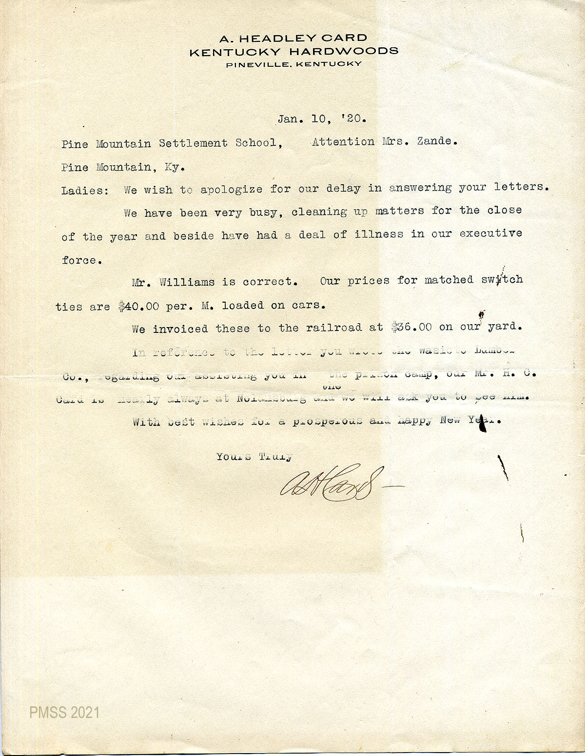 03 January 10, 1920. To Zande from A. Headley Card, Kentucky Hardwoods, Pineville, Ky., stating that Mr. Williams is correct that “our prices for matched switch ties are $40.000 per M. loaded on cars. We invoice these to the railroad at $36.00 on our year.” He refers Zande to Card concerning the prison camp.