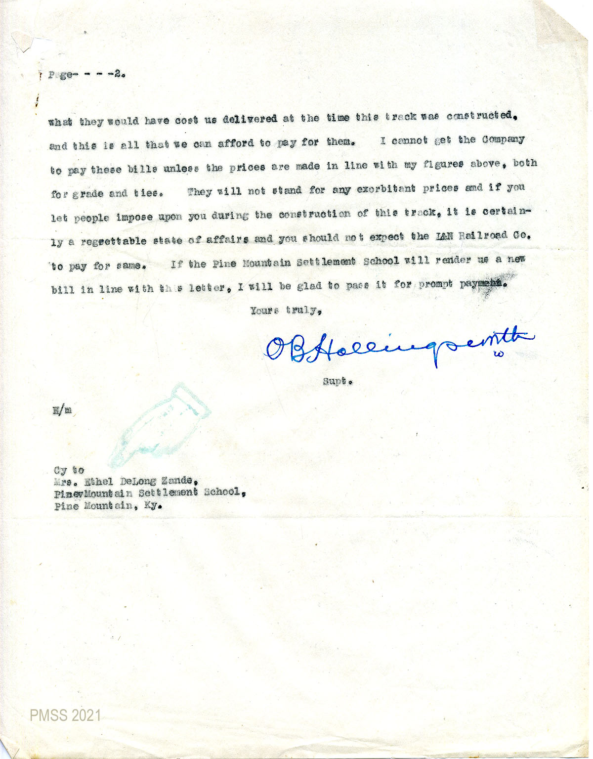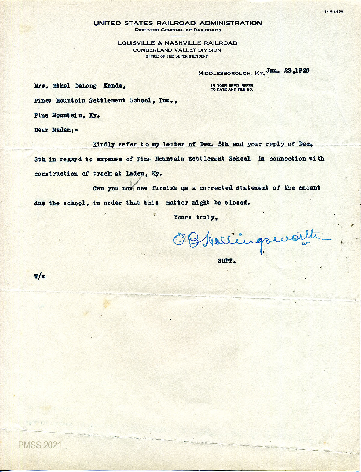 14 January 23, 1920. To Zande from O.B. Hollingsworth, Superintendent, U.S. Railroad Administration, Louisville & Nashville Railroad, Middlesborough, Ky. Asks for “a corrected statement of the amount due the school” for the construction of track at Laden, Ky.