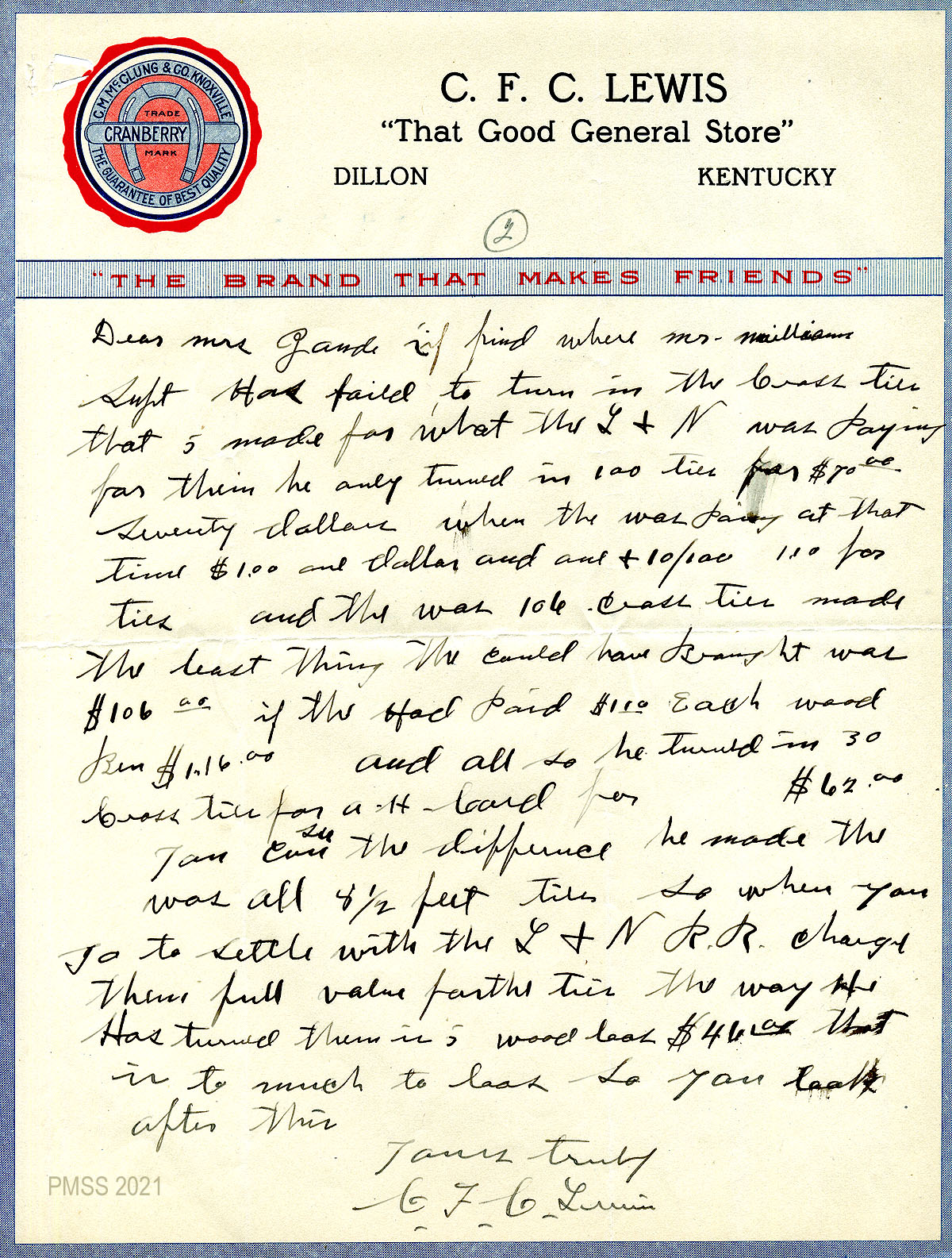 15 – 16 January 24, 1920. Two-page handwritten letter to Zande from C.F. C. Lewis, Dillon General Store, Dillon, Ky., [15] reporting that water is pouring onto the “Pike Road.” He offers to “get some men and cut some ditches and save the road. The water is ruining the road.” [16] He states the cost and number of cross ties turned in by Mr. Williams so that Zande knows what to charge L&N Railroad.