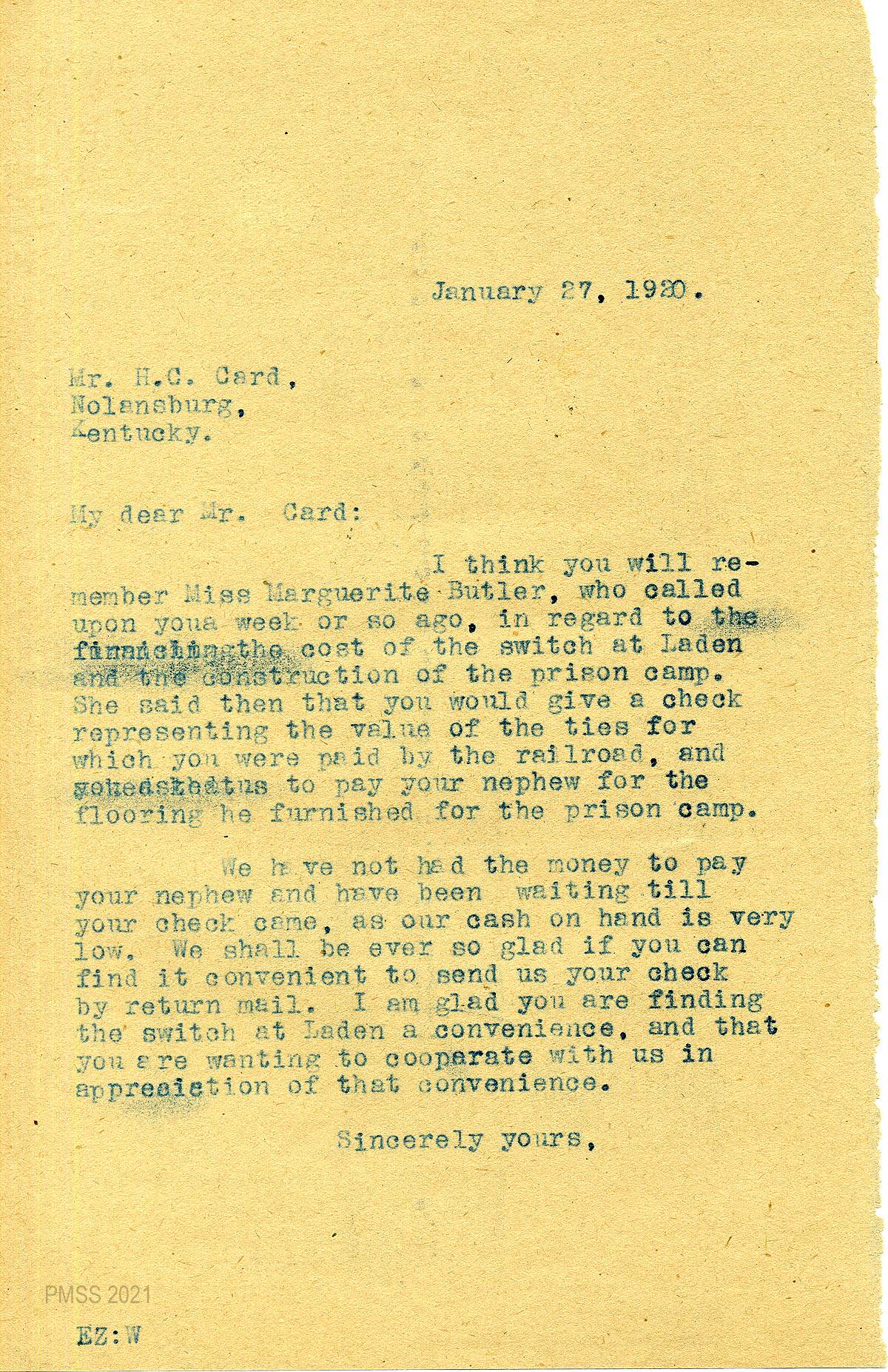 18 January 27, 1920. To Card from EZ (Zande), asking him to send a check for the ties which the railroad had paid him for. Then she will be able to pay his nephew for the prison camp flooring. “I am glad you are finding the switch at Laden a convenience, and that you are wanting to cooperate with us in appreciation of that convenience.”