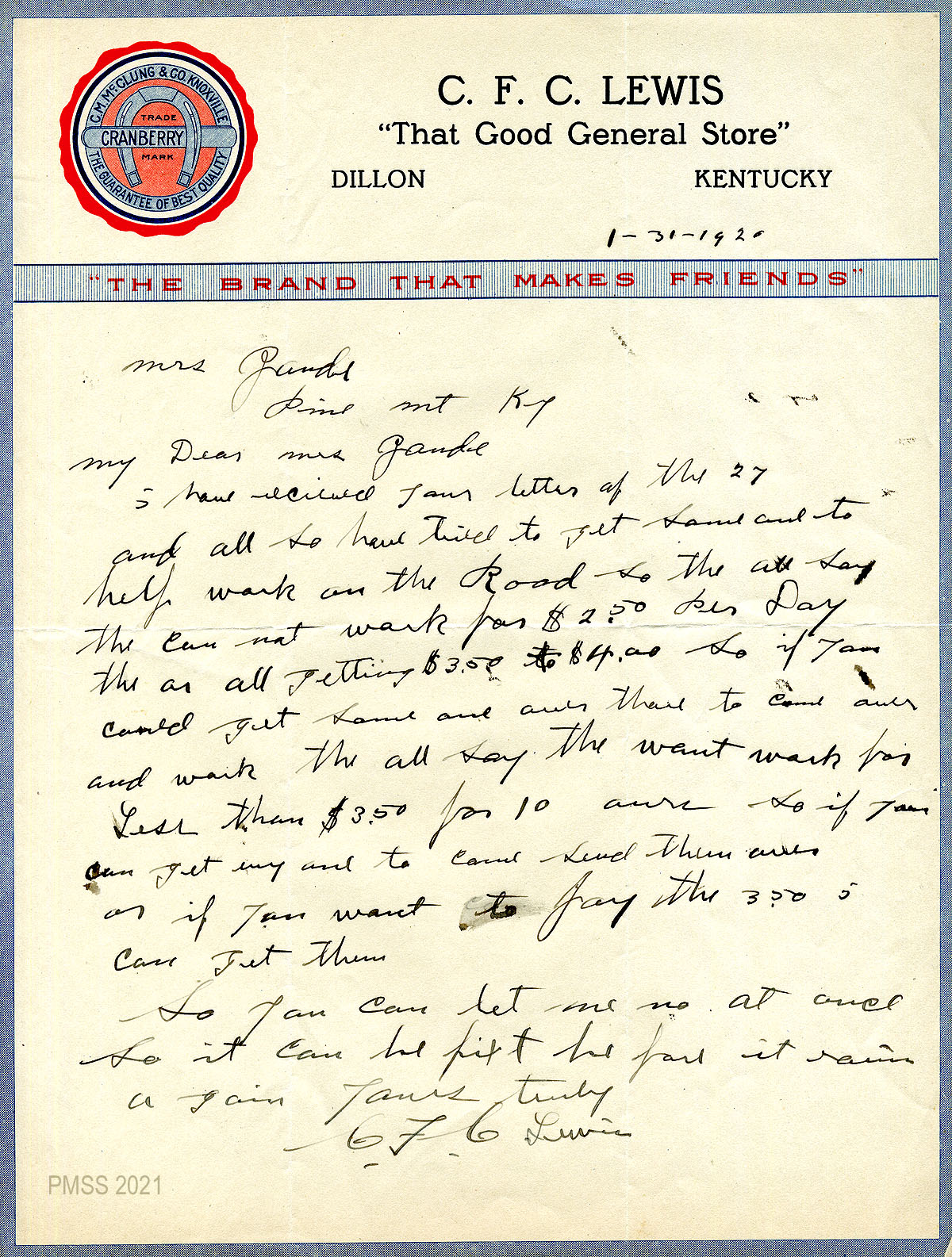 27 January 31, 1920. Handwritten letter to Zande from Lewis, who cannot get men to work for $2.50 a day, when they can get $3.50 to $4.00.