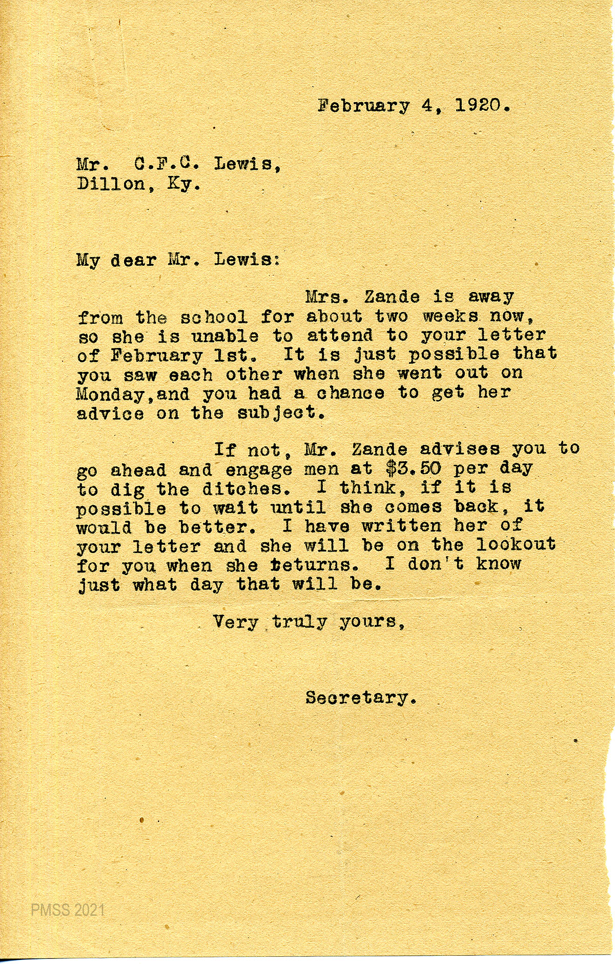 32 February 4, 1920. To Lewis, Dillon, Ky., from (unsigned), Secretary. Mrs. Zande is away but Mr. (Luigi) Zande advises Lewis to hire the men at $3.50 per day to dig the ditches; it would be better to wait until Mrs. Zande returns.