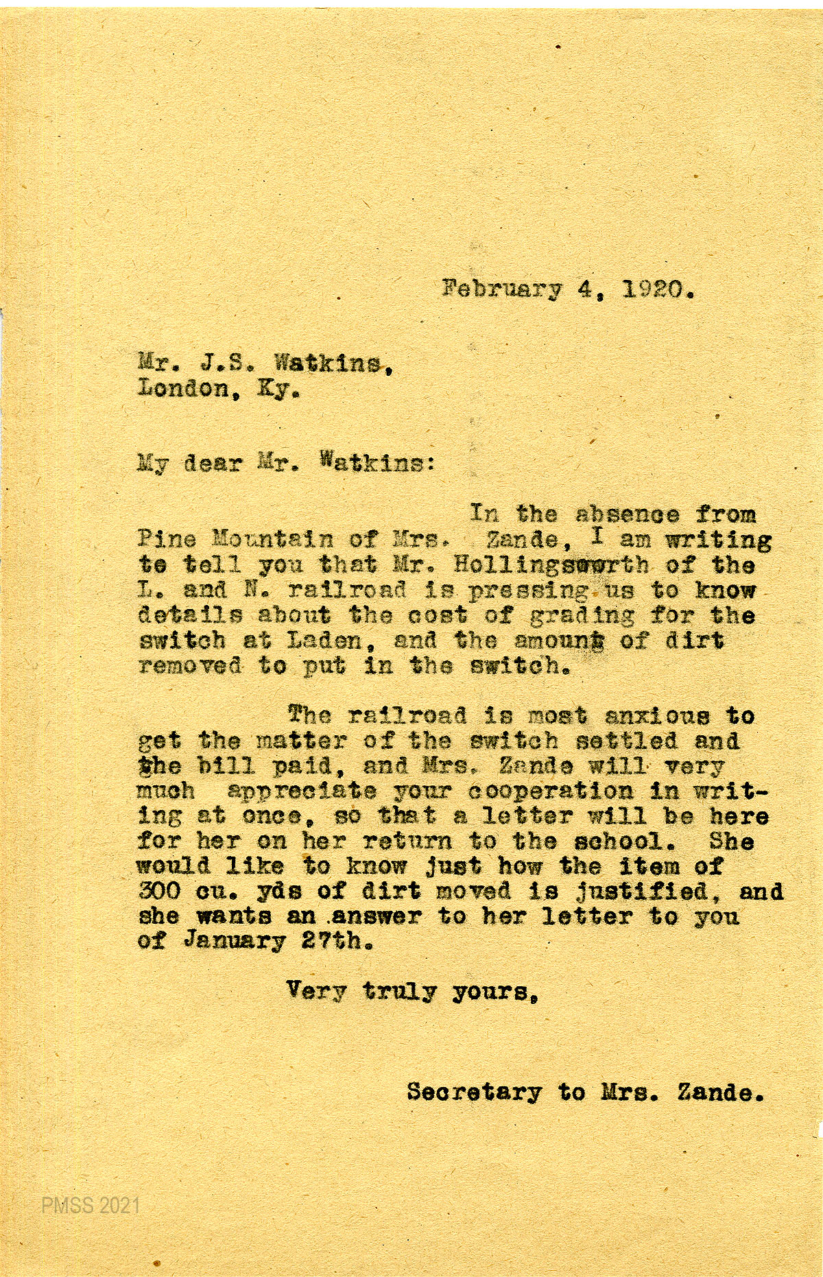 33 February 4, 1920. To Watkins from (unsigned), Secretary to Mrs. Zande, asking him for the cost of grading for the Laden switch and the amount of dirt removed to put in the switch. Hollingsworth of L&N is anxious to get the bill paid. Mrs. Zande wants an answer to her January 27th letter.