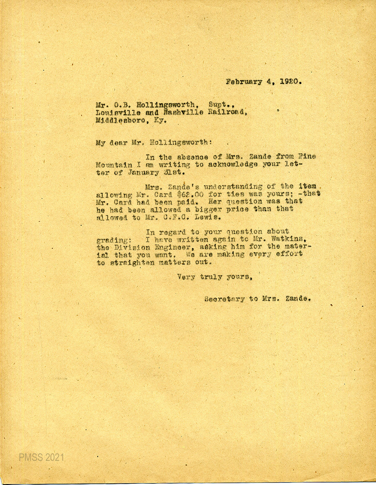 34 February 4, 1920. To Hollingsworth from (unsigned), Secretary to Mrs. Zande, questioning the cost of the ties allowed to Card which was more than allowed to Lewis. The Secretary has written to Watkins about the grading.
