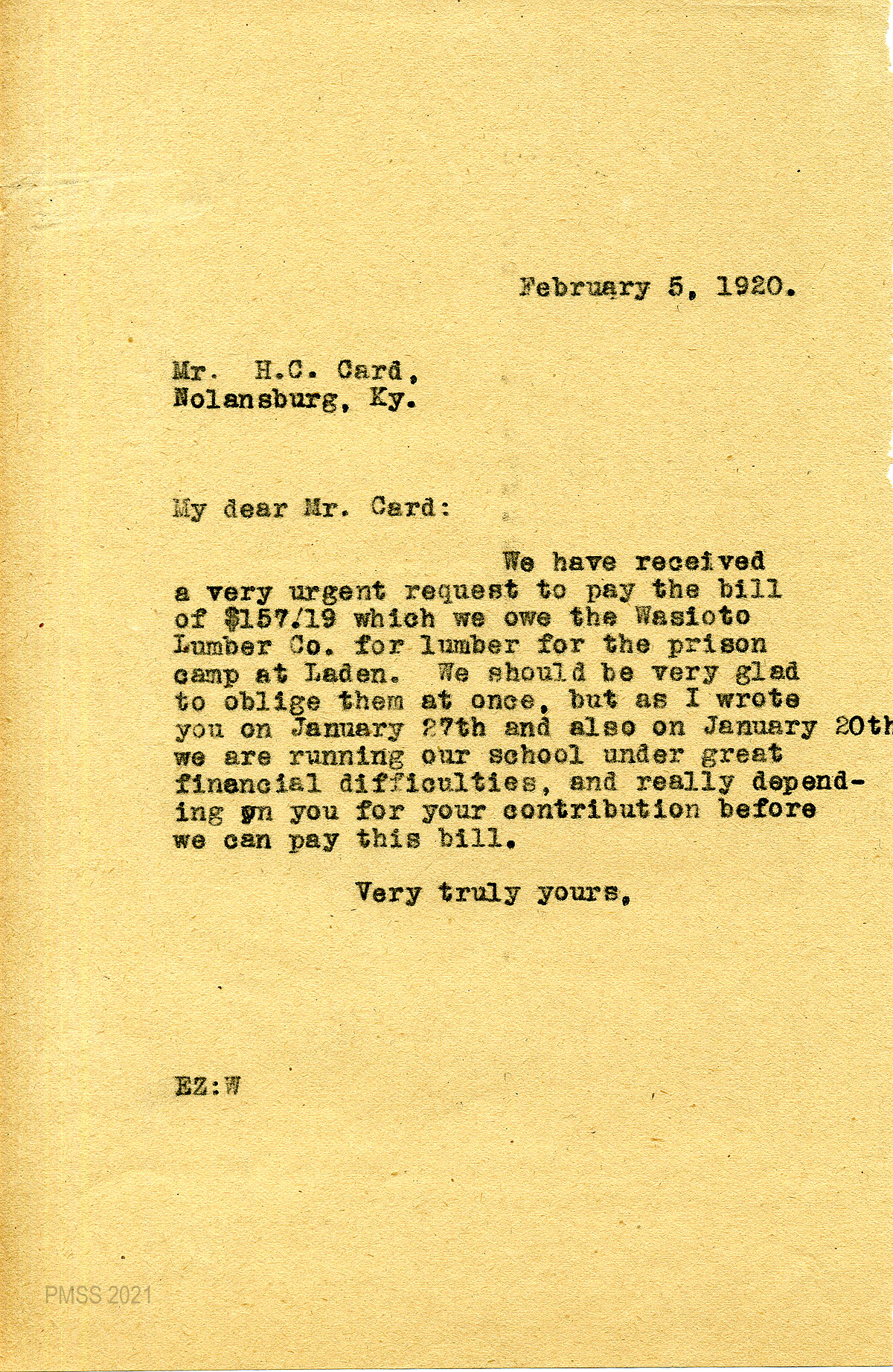 36 February 5, 1920. To Card from EZ (Zande), concerning a bill from Wasioto Lumber Co.: “We are running our school under great financial difficulties and really depending on you for your contribution before we can pay this bill.”
