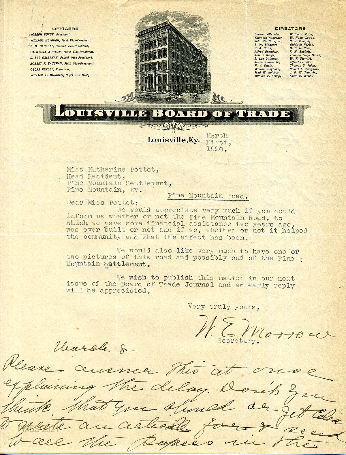 49 – 50 March 1, 1920. To Katherine Pettit from W.E. Morrow, Secretary, Louisville Board of Trade, asking for information about the Pine Mountain Road and the School to publish in the next issue of the Board or Trade Journal. March 8, 1920. Handwritten message at end of the letter, possibly from Pettit, with directions on how to answer; suggests that the recipient of this message or Celia (Cathcart) write an article and “send to all the papers in the towns that helped with the road.” Also, send a leaflet to “all who gave to the road fund.”