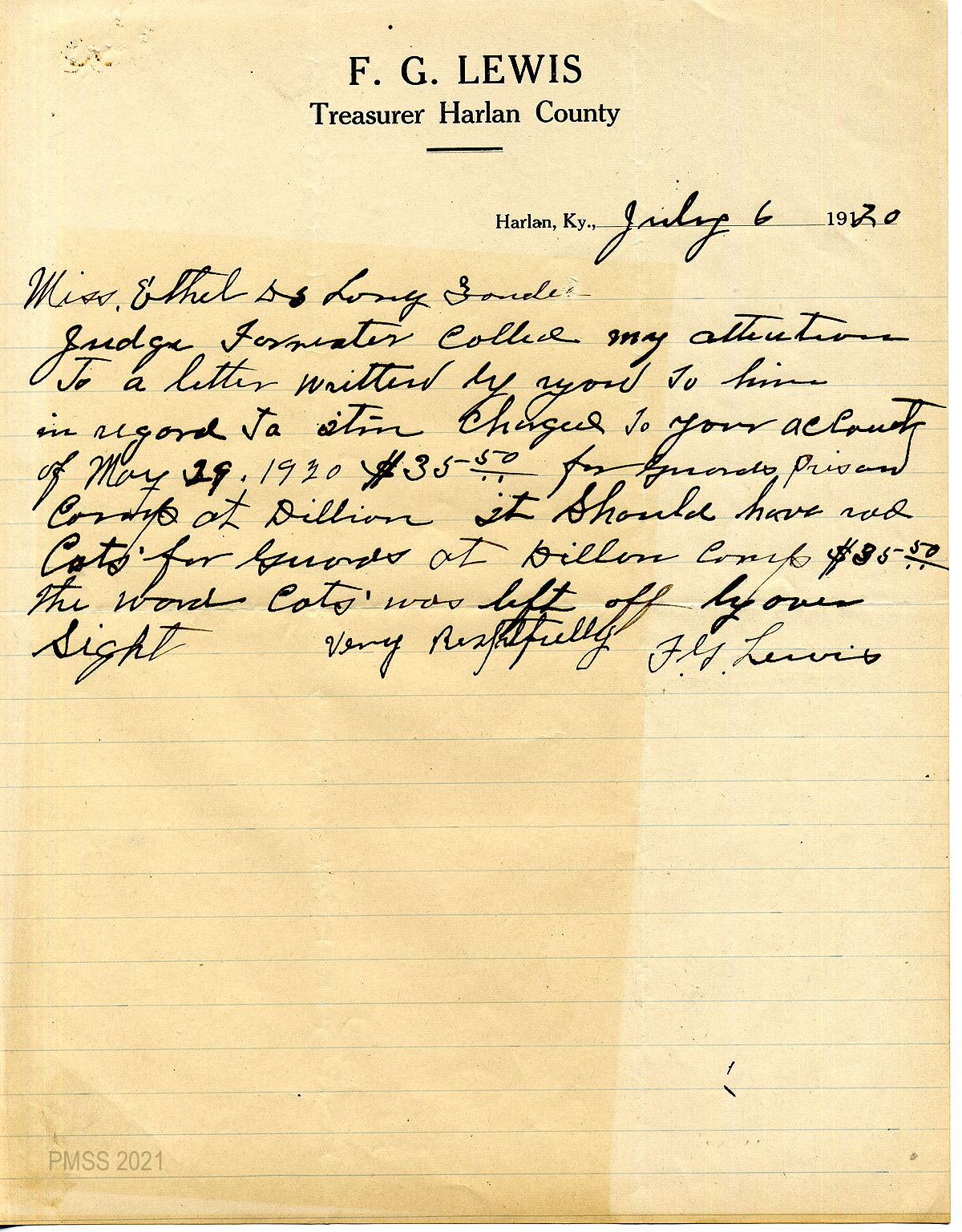 F.G. Lewis – Harlan County Treasurer, Harlan, Ky.