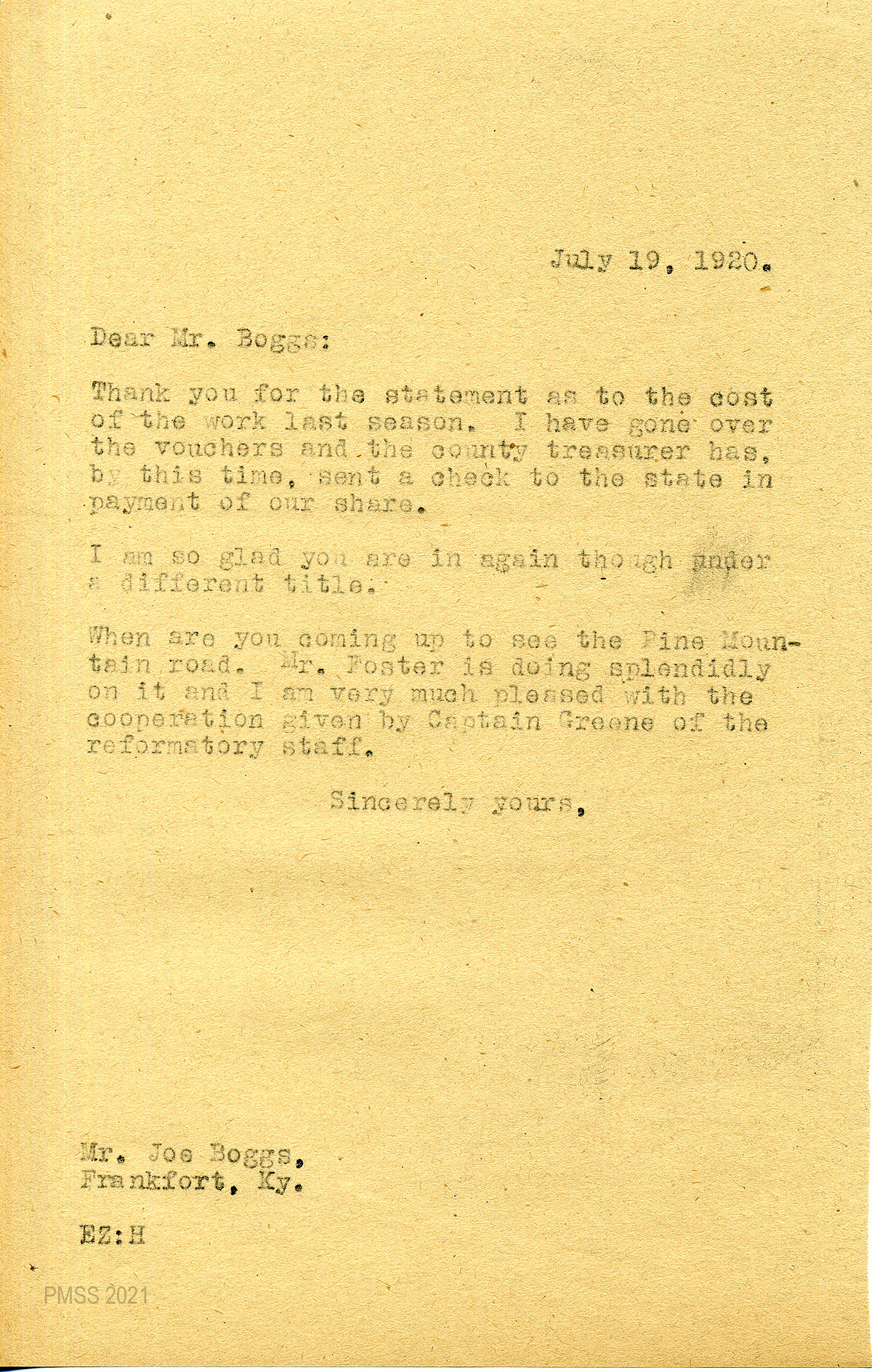 104 July 21, 1920. To Johnson from EZ (Zande), asking why PMSS is billed for the activities of a Harlan County engineer. Mentions that “Mr. Boggs is a good backer for that road and has put a fine man in charge, Mr. Foster.”