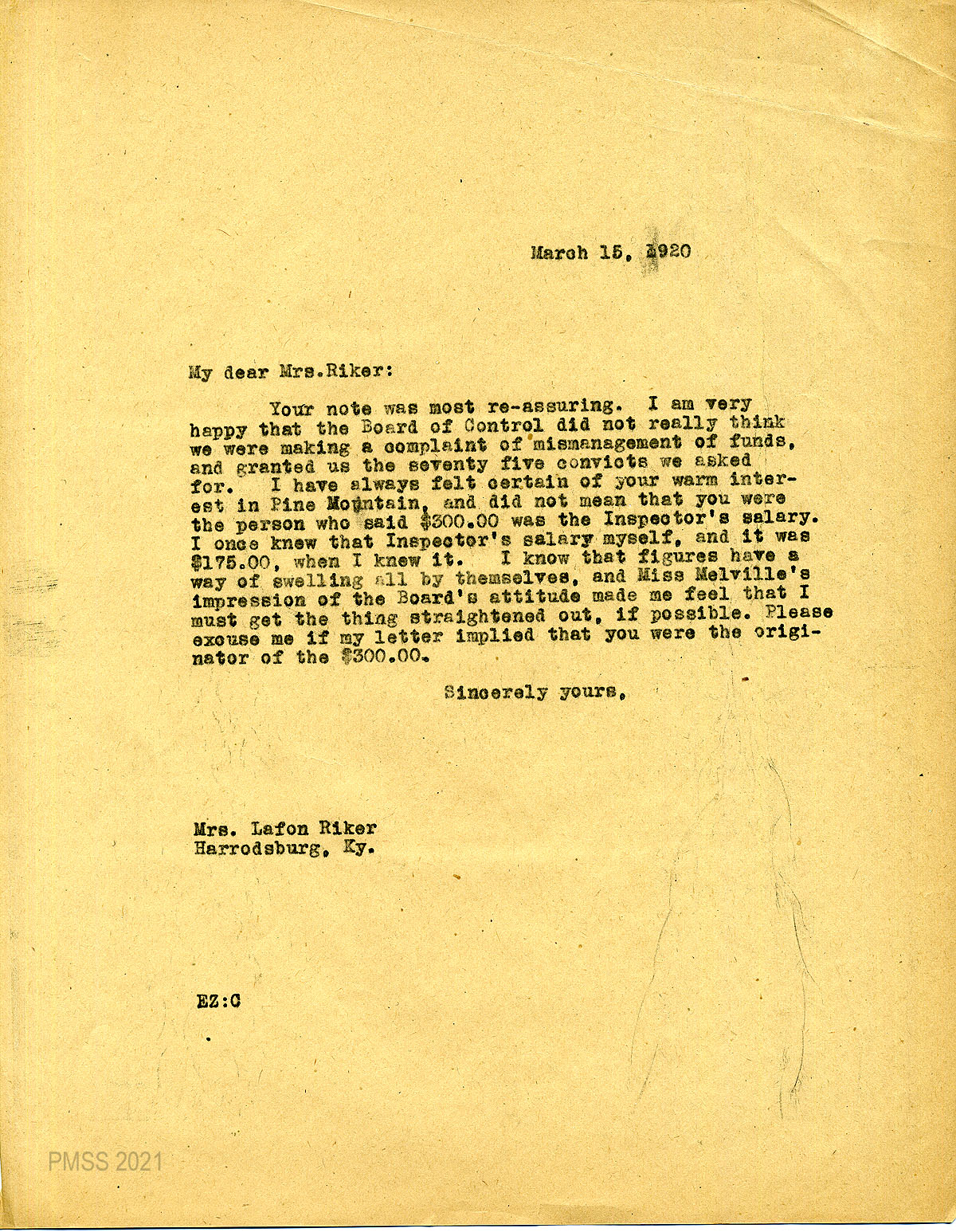 65 March 9, 1920. To Zande from Mrs. Riker, on letterhead for “President, Kentucky Federation of Women’s Club, Harrodsburg, Ky.,” who assured Zande that “[t]here has not been any disposition on the part of the board to feel that you are in any way unjustly criticising (sic) the work of the State last year.” She has learned that the School was granted 75 convicts, so no harm was done.