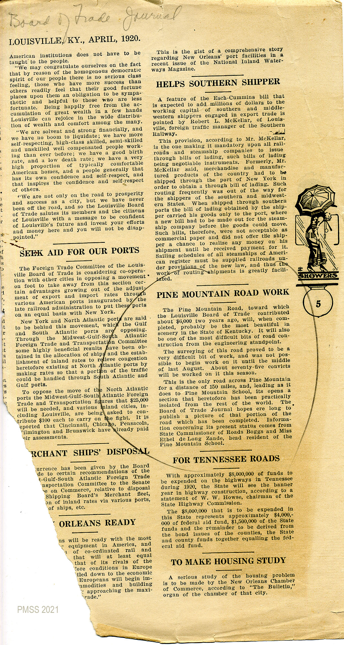 78-79 April 1, 1920. Clipping of two pages in the Board of Trade Journal. [78] “Board of Trade Business: Issued by Publicity Division Louisville Board of Trade to Aid Members…., Vol. II. Louisville, KY,” displaying a list of “Industrial Enterprises.” [79] Several short articles include one titled “Pine Mountain Road Work.”