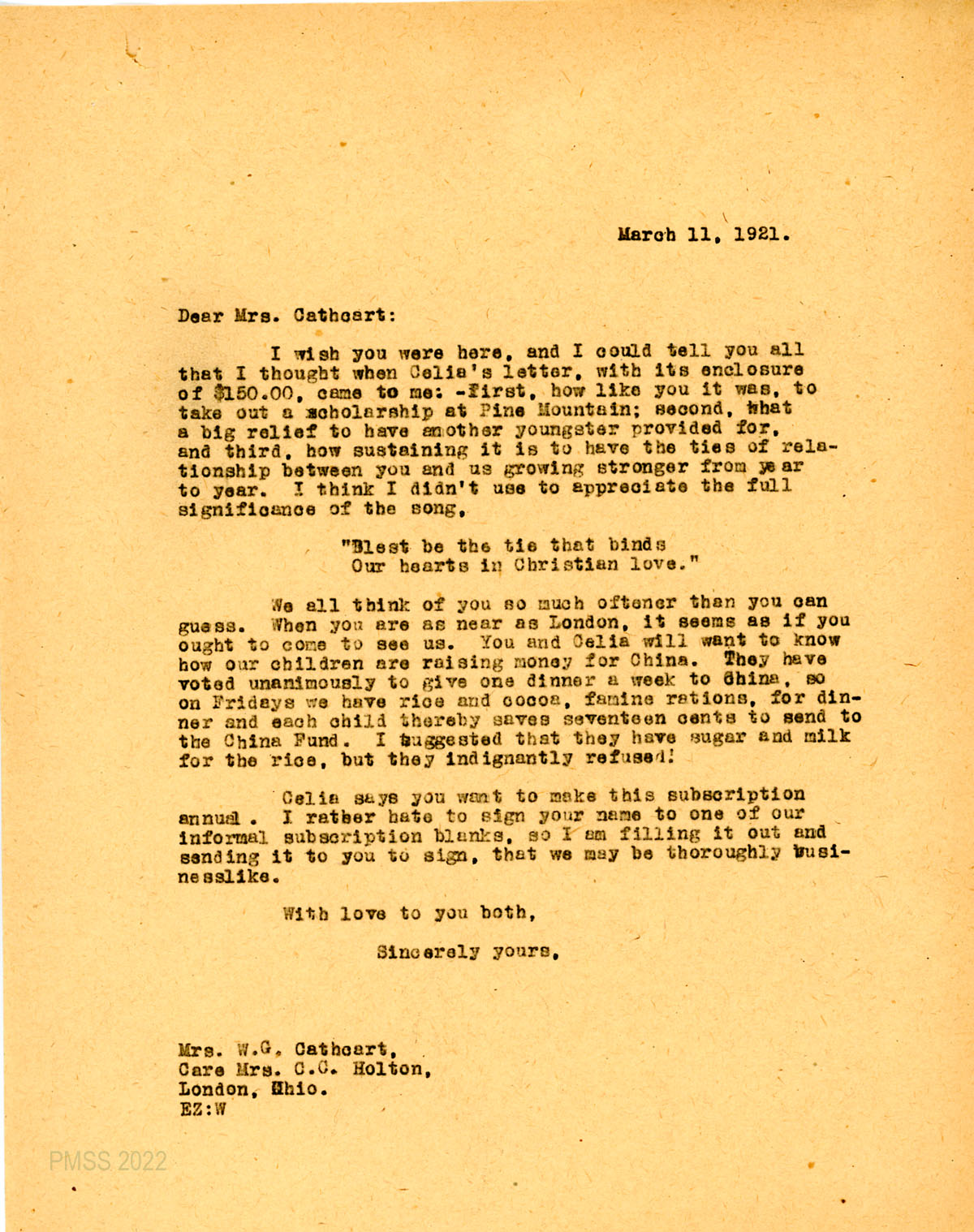 001 March 11, 1921. To Mrs. W.G. Cathcart, Care Mrs. C.C. Holton, London, Ohio, from EZ (Ethel de Long Zande), expressing appreciation for the $150 enclosed in Celia [Cathcart]’s letter for a PMSS scholarship. She tells of the students eating rice and cocoa for dinner once a week to save money for the China Fund. “Celia says you want to make this subscription annual,” so Zande encloses a subscription blank.