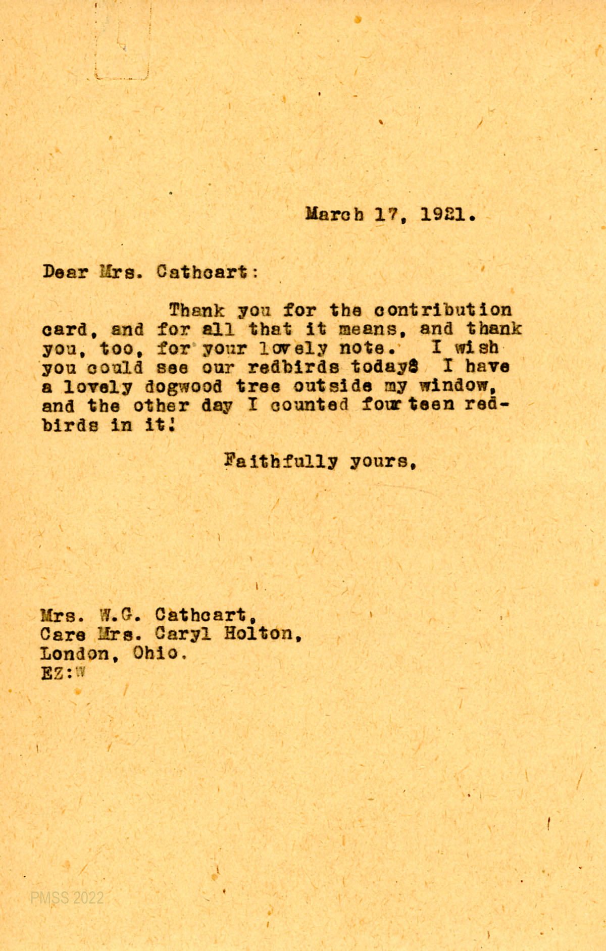 002 March 17, 1921. To Mrs. W.G. Cathcart, Care Mrs. Caryl Holton, London, Ohio, from EZ (Zande), thanking her for returning her signed contribution card and “lovely note.” Describes a “dogwood tree outside my window, and the other day I counted fourteen redbirds in it!”