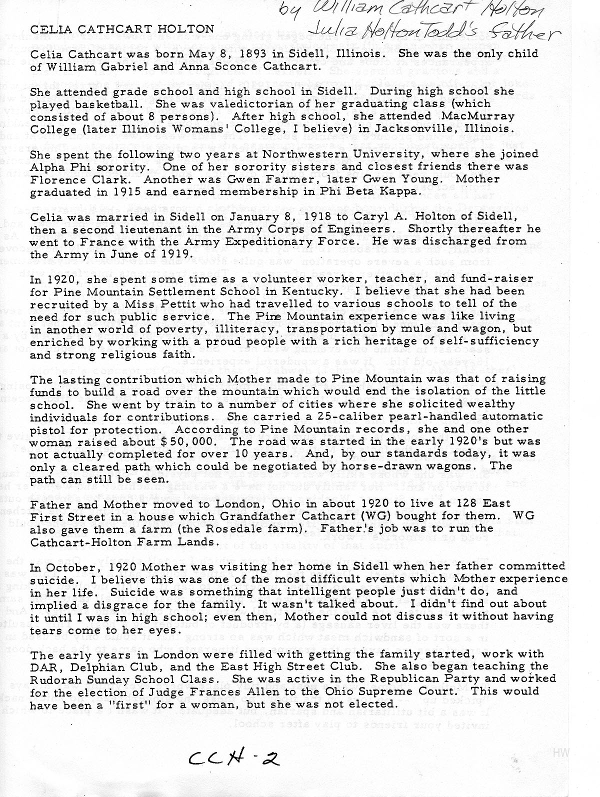 Biographical sketch of Celia Cathcart Holton by her son, William Cathcart Holton (Julia Holton Todd’s father), written in 1984 [001-004]. Supplementary notes were provided by her other son, Richard H. Holton [005].