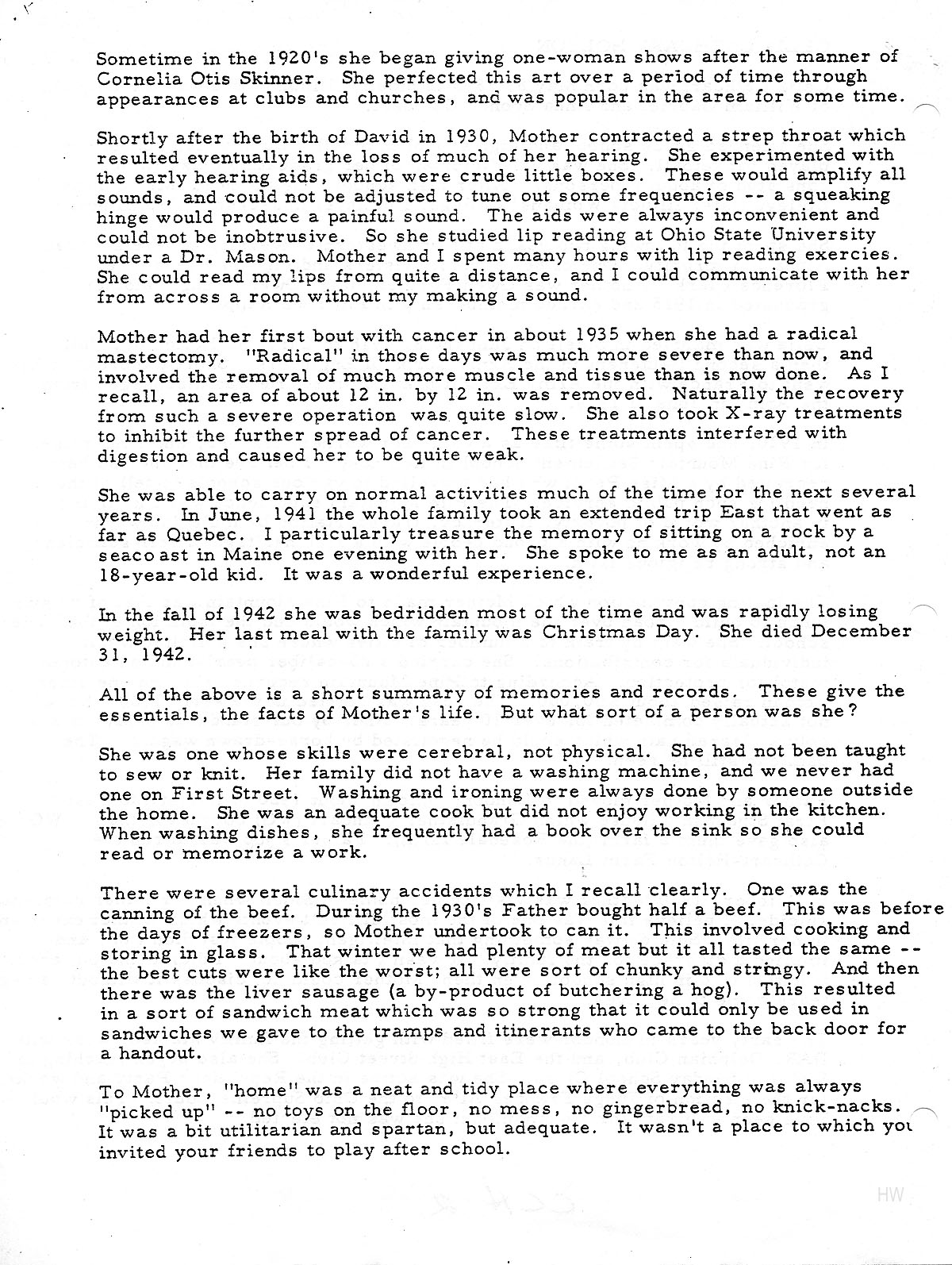 Sometime in the 1920’s she began giving one-woman shows after the manner of Cornelia Otis Skinner. She perfected this art over a period of time through appearances at clubs and churches, and was popular in the area for some time. Shortly after the birth of David in 1930, Mother contracted a strep throat which resulted eventually in the loss of much of her hearing. She experimented with the early hearing aids, which were crude little boxes. These would amplify all sounds, and could not be adjusted to tune out some frequencies — a squeaking hinge would produce a painful sound. The aids were always inconvenient and could not be unobtrusive. So she studied lip reading at Ohio State University under a Dr. Mason. Mother and I spent many hours with lip reading exercises. She could read my lips from quite a distance, and I could communicate with her from across a room without my making a sound.