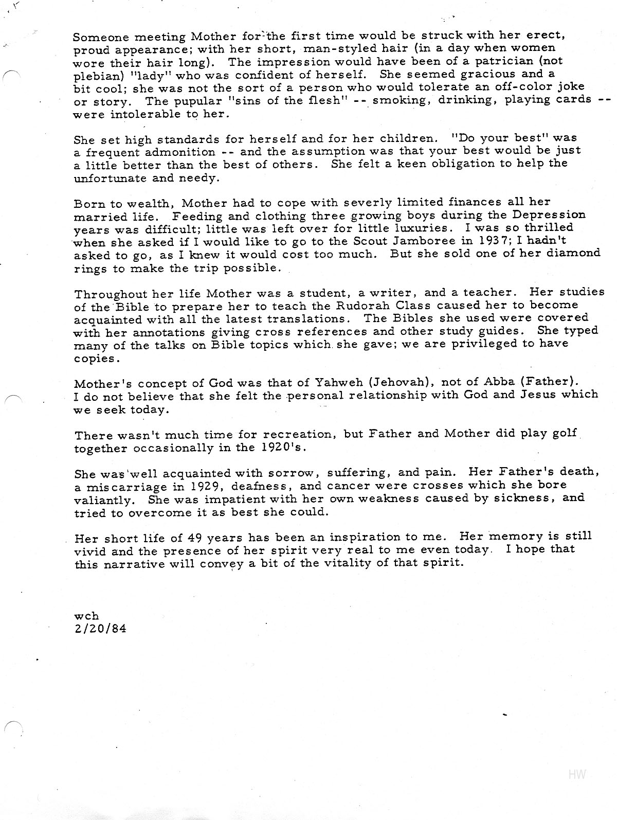Someone meeting Mother for the first time would be struck with her erect, proud appearance; with her short, man-styled hair (in a day when women wore their hair long). The impression would have been of a patrician (not plebeian) “lady” who was confident of herself. She seemed gracious and a bit cool; she was not the sort of a person who would tolerate an off-color joke or story. The popular “sins of the flesh” — smoking, drinking, playing cards — were intolerable to her.