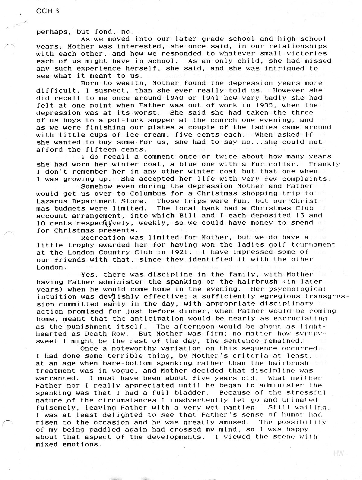 Born to wealth, Mother found the depression years more difficult, I suspect, than she ever really told us. However she did recall to me once around 1940 or 1941 how very badly she had felt at one point when Father was out of work in 1933, when the depression was at its worst. She said she had taken the three of us boys to a pot-luck supper at the church one evening, and as we were finishing our plates a couple of the ladies came around with little cups of ice cream, five cents each. When asked if she wanted to buy some for us,