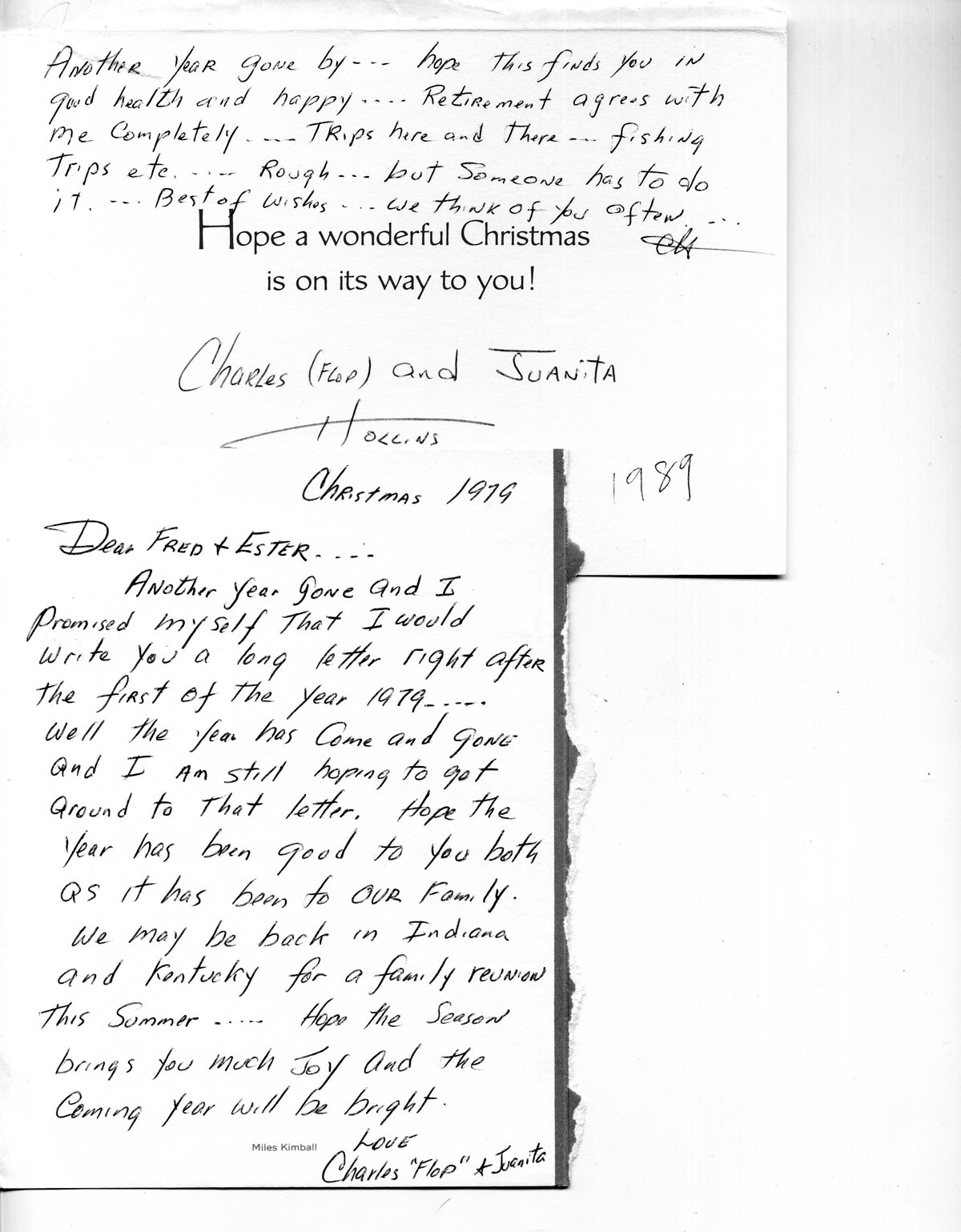 001 December 1979 and 1989. Christmas cards to Fred & Esther [Burkhard] from Charles (“Flop”) and Juanita Hollins. [1979] “Retirement agrees with me completely….” [1989] “We may be back in Indiana and Kentucky for a family reunion this Summer….”