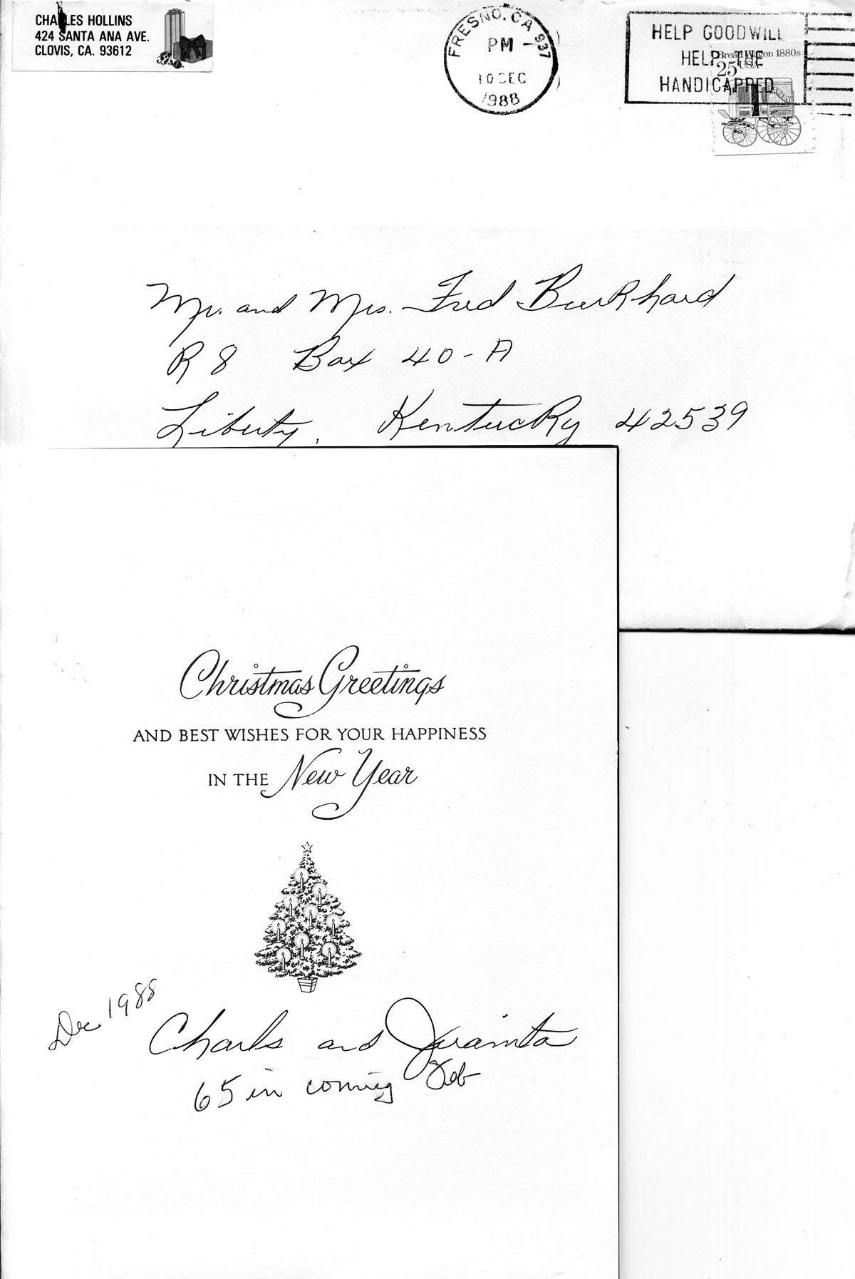 002 December 1988. Christmas card to Mr. and Mrs. Fred Burkhard, Liberty, KY from “Charles and Juanita,” Hollins, Clovis, CA. [Notation: “65 in coming Feb.”]