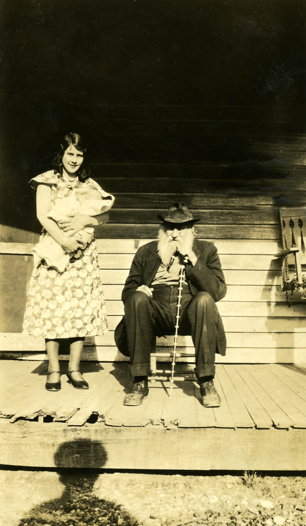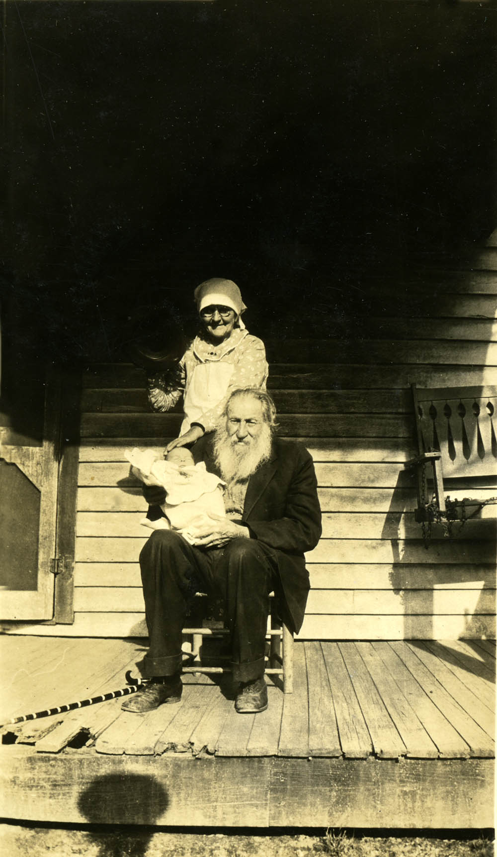 Uncle Ira Combs [preacher] seated on porch, holding his great-grandchild and with woman standing behind. FN Vl_35_1138.jpg
