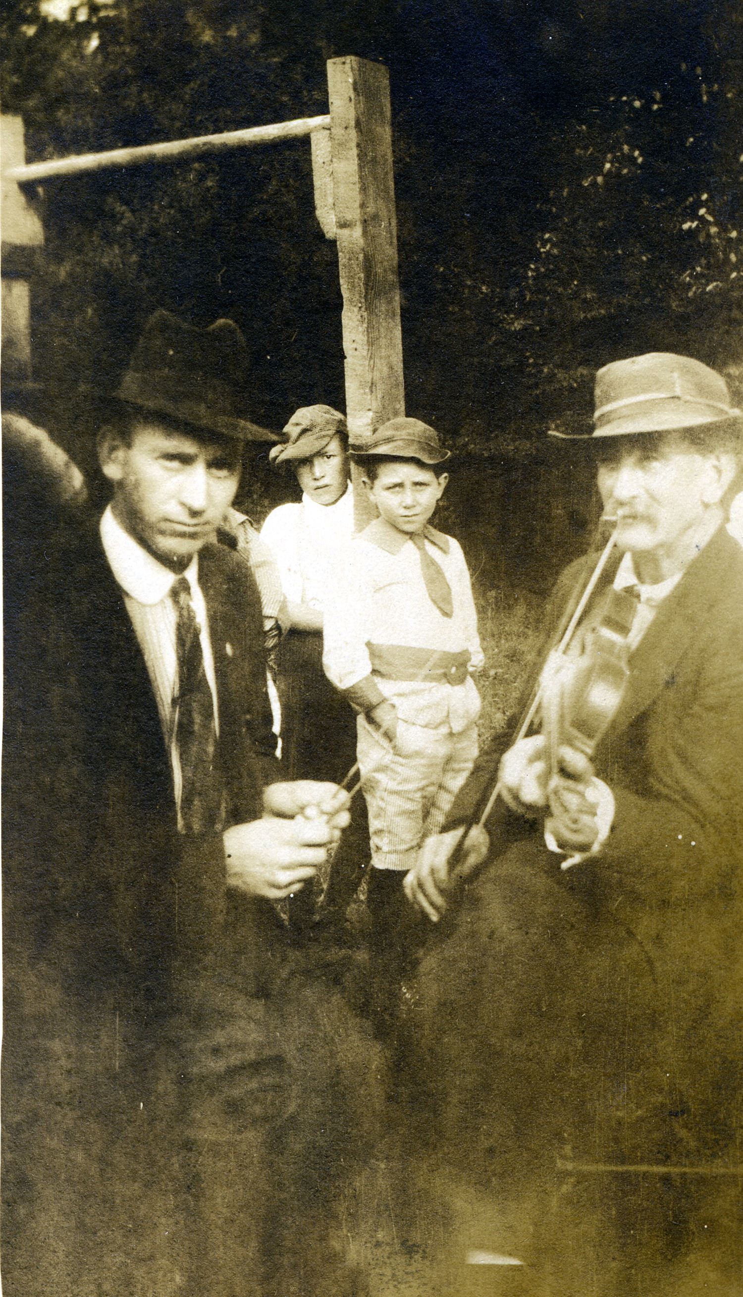 - Frances Lavender Album. Fair Day, Sept. 1918. “Green Cornett, the fiddler from Line Fork, and Bird Turner ‘beating.’ He is the school teacher on Big Laurel.” [lave025.jpg]