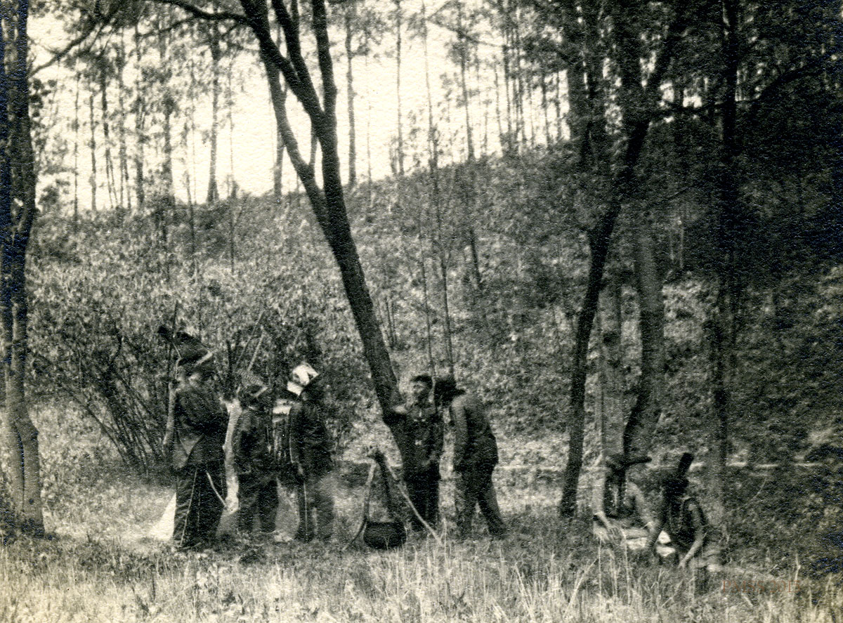 - (Left to right) Frank Cornett, Columbus Creech, [unknown], and Emily Hill at foot of large poplar tree. [X_100_workers_2539.jpg]