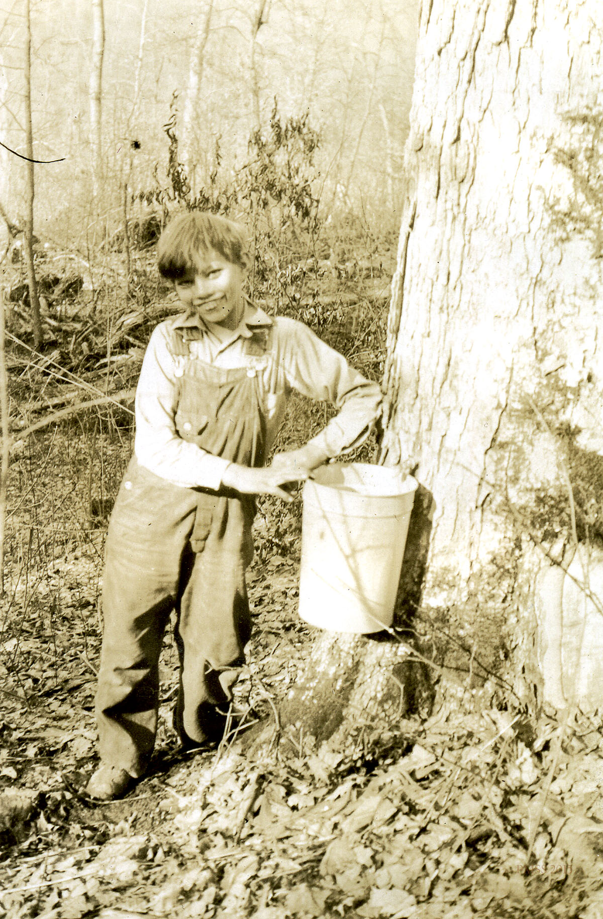 - “Charles Creech” (son of Delia & Henry Creech) with maple syrup bucket at tree. [kingman_008c.jpg]