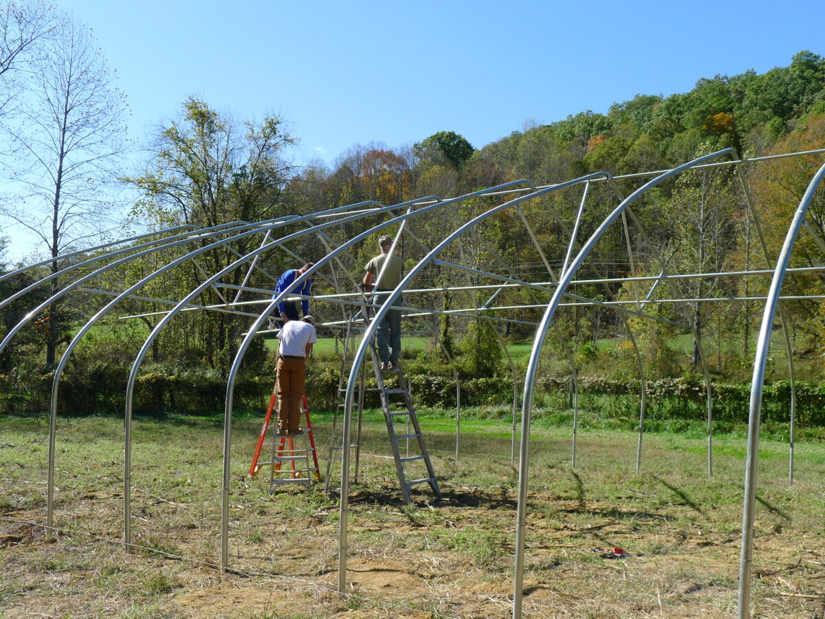 - Vegetable Tunnels under construction. 2015. Paul Creech on ladder. [p1110474.jpg]