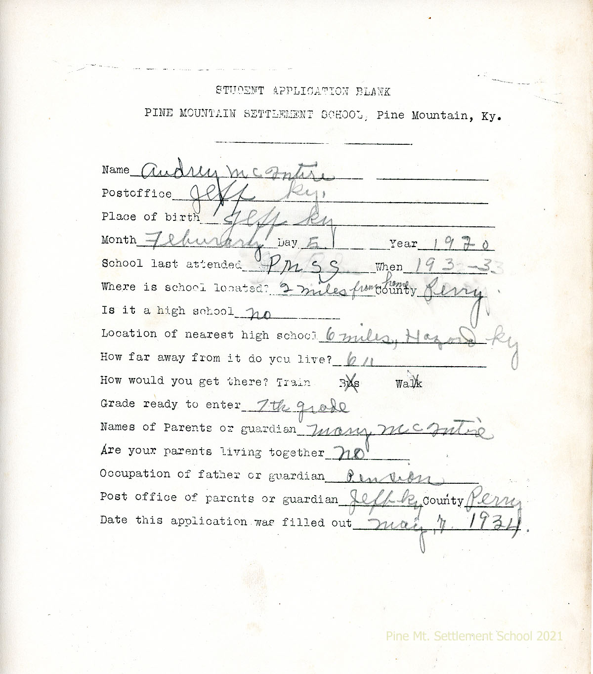 002 May 7, 1934. STUDENT APPLICATION BLANK for Audrey McIntire, Jeff, Ky. Born on February 5, 1920, in Jeff, Ky. School last attended: PMSS in 1933. Grade ready to enter: 7th. Parent: Mary McIntire. Occupation of father or guardian: Pension.