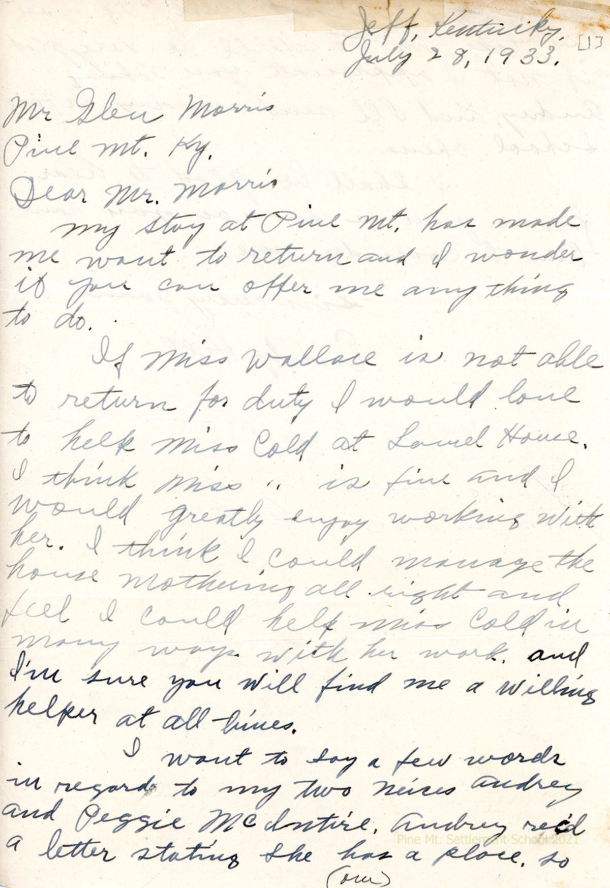 005-005a July 28, 1933. Two-sided letter to Morris from Emily Hill, Jeff, Ky., offering to return to PMSS to replace Miss Wallace or help Miss (Edith) Cold at Laurel House as housemother. Asks if her nieces, Audrey and Peggy McIntire, can both be taken by PMSS.