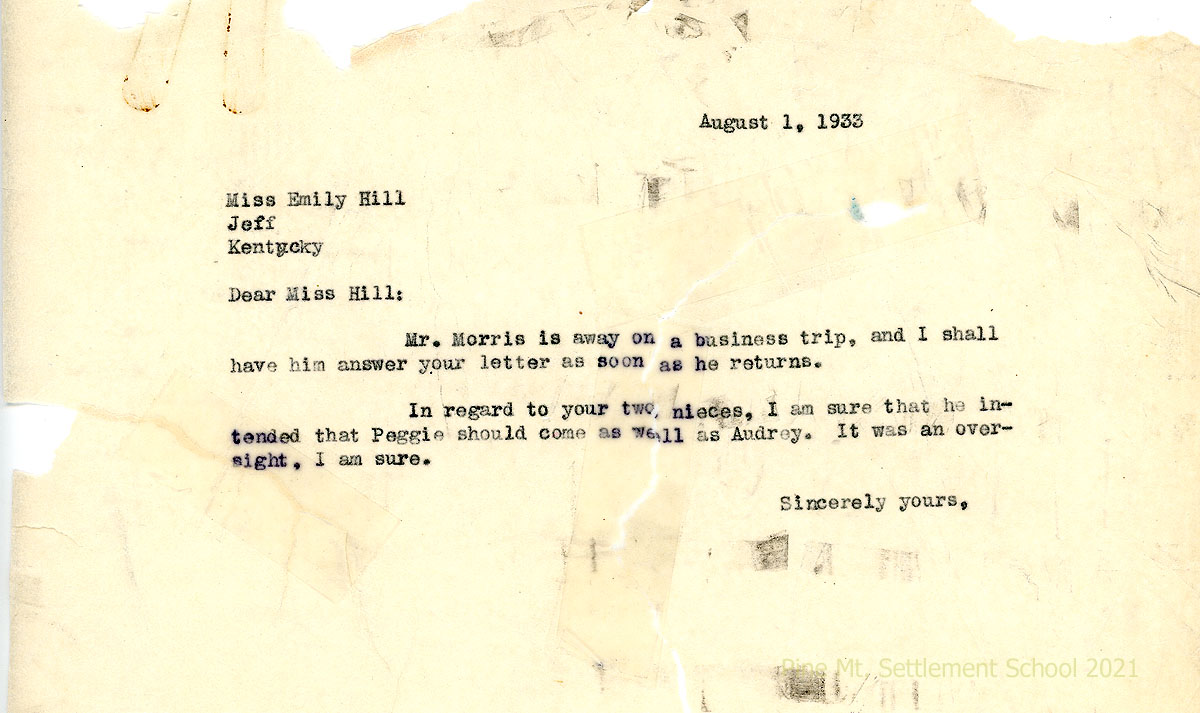 007 August 7, 1933. To Emily Hill from Morris, declining her offer to work at PMSS as the housemother position is filled. Assures her that both nieces are accepted by PMSS.